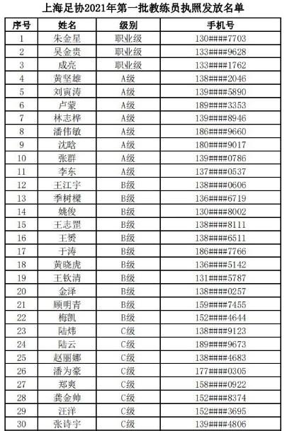 此次上海足协2021年第一批等级教练员执照名单一共有308人,其中职业级3人,A级8人,B级11人,C级100余人,D级100余人。