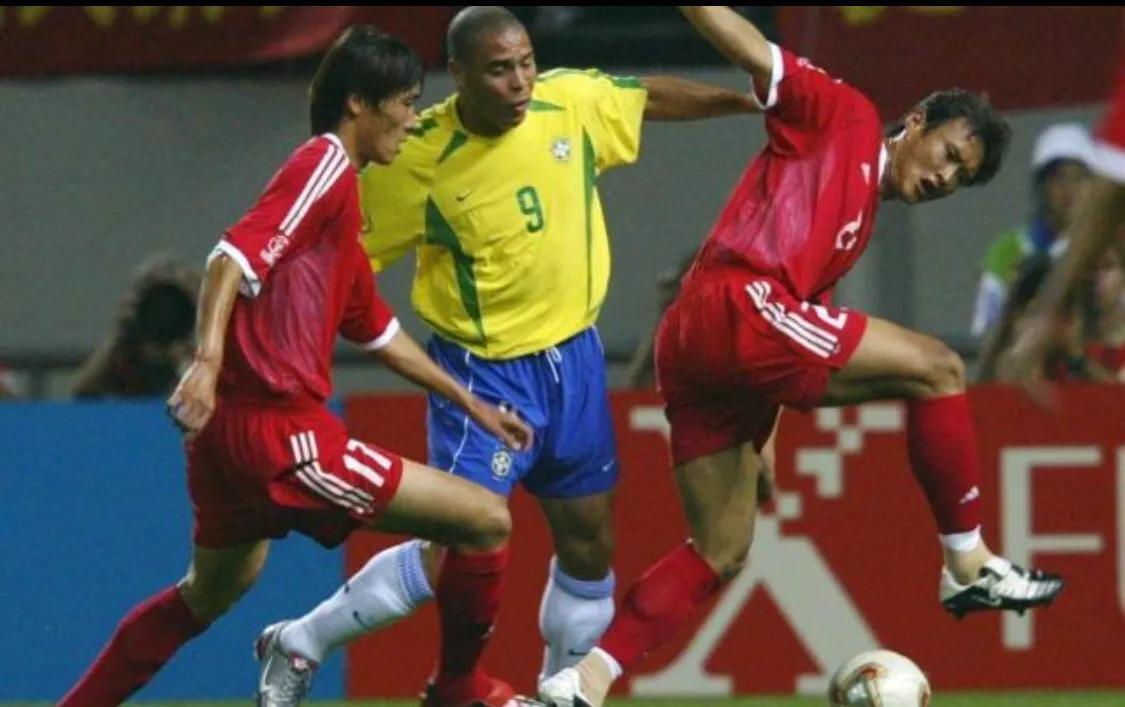 在2002年韩日世界杯上,中国男足参加3场小组赛,中国队虽拼尽全力,终究落败,比赛成绩分别是:第一场:中国对阵哥斯达黎加,比分0:2;第二场:中国对阵土耳其,比分0:3;第三场:中国对阵巴西,比分0:4;中国队0得分0进球,最后在32强中仅高于被德国队8比0痛宰的沙特队,名列31位。
