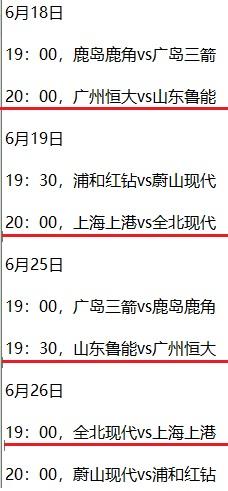根据时间安排,恒大将在6月18日20点主场对阵鲁能;双方第二回合将在6月25日19:30,鲁能回到主场迎接恒大的挑战,另外一支中超球队,将分别于6月19日晚8点和6月26日晚19点先主后客对阵K联赛冠军全北现代。
