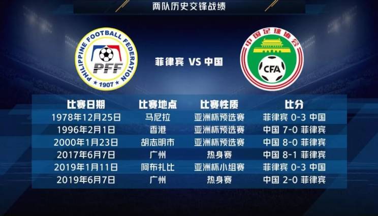 国足前3次与菲律宾交手均是亚洲杯预选赛,国足取得三战全胜的成绩,三场比赛共攻入18球。2017年,里皮率领国足在热身赛中8-1大胜菲律宾。2019年亚洲杯小组赛,国足凭借武磊的梅开二度和于大宝的进球,3-0击败菲律宾,提前一轮晋级亚洲杯16强。接下来在里皮二进宫国足的首秀中,国足2-0击败菲律宾,吴曦和张稀哲分别建功。