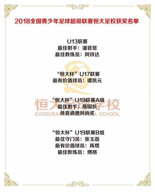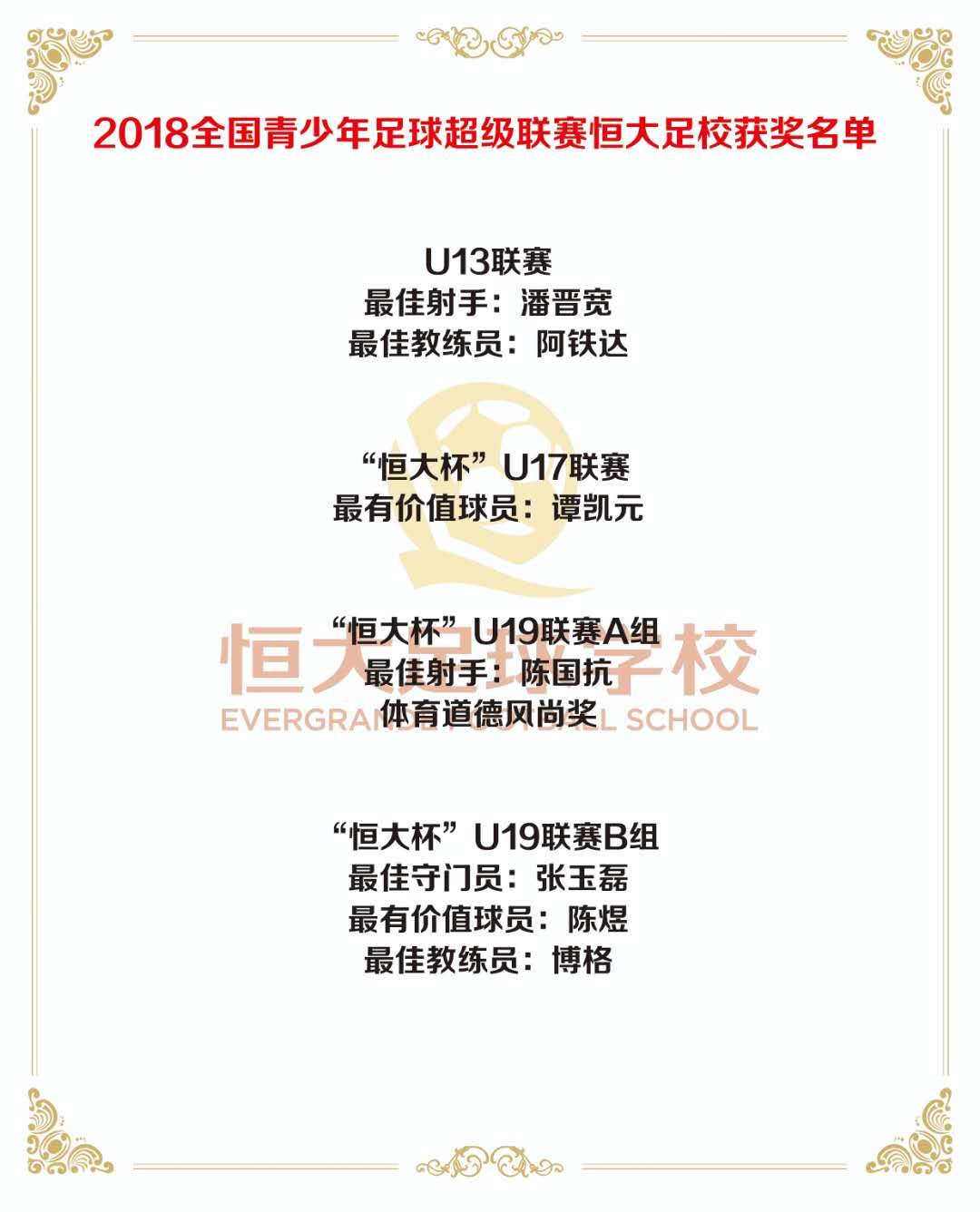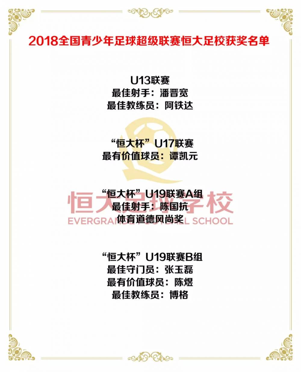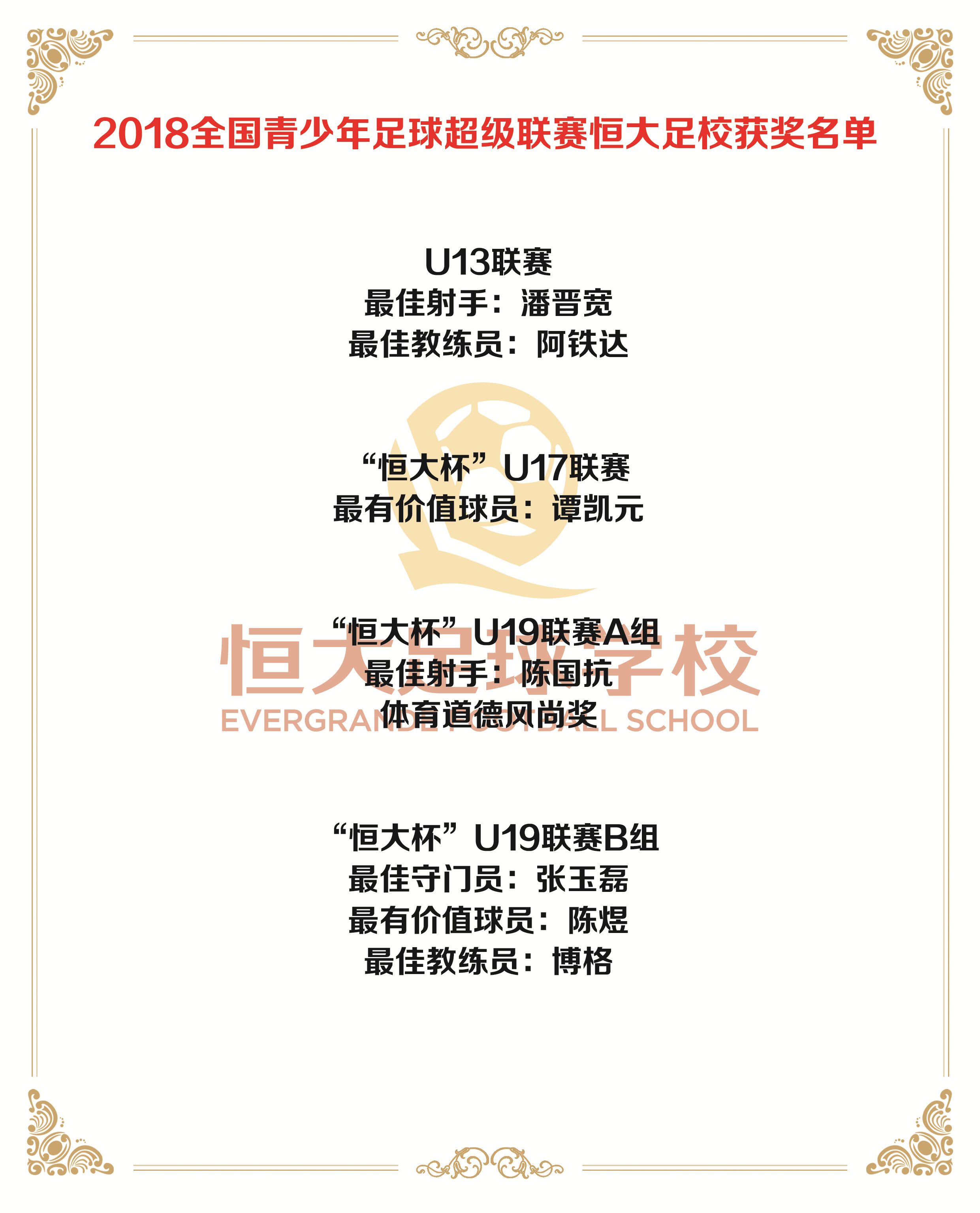 12月26日,2018中国足协青少年足球竞赛工作会议暨全国青超联赛年度颁奖礼举行,恒大足校揽得8项年度大奖,获奖数量首次位居榜首。其中,5名获奖球员表现抢眼:陈国抗以23个进球的优异表现获U19A组联赛最佳射手奖,他被业内人士看作是郜林的接班人;潘晋宽在总决赛5场进5球,为球队夺冠立下头功,获U13组最佳射手奖;司职中锋的陈煜力助球队提前三轮夺冠,获U19-B组最有价值球员奖,张玉磊获最佳守门员奖;谭凯元获U17组最有价值球员奖,他曾在今年恒大U17国际冠军杯赛上进3球崭露头角,被誉为小于汉超,今年更是被卡纳瓦罗提拔到了恒大一线队报名中超联赛。