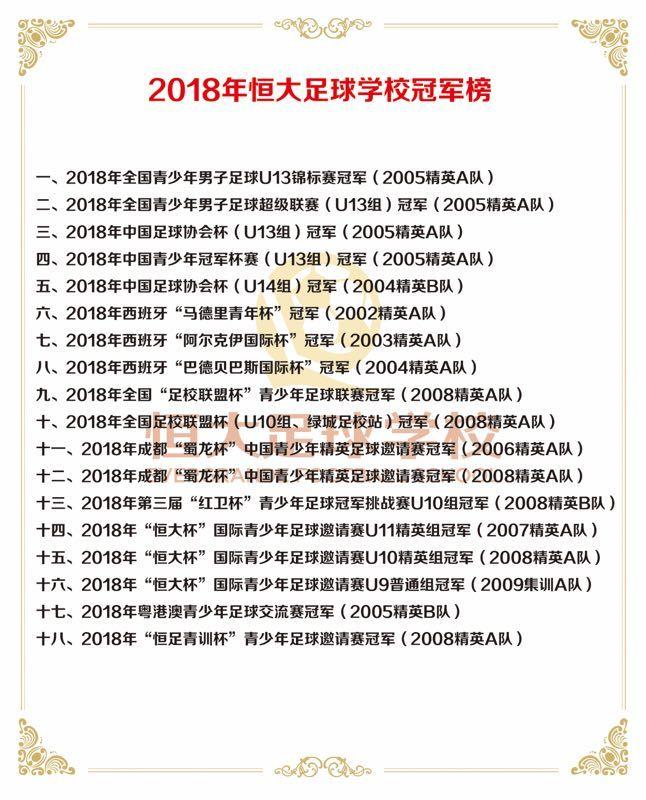 恒大足校2018年获得的18项冠军,不仅包括目前国内青训四大赛:青超联赛、青少年锦标赛、青少年足协杯赛和青少年冠军杯赛,还有西班牙“马德里青年杯”等欧洲青训赛事。