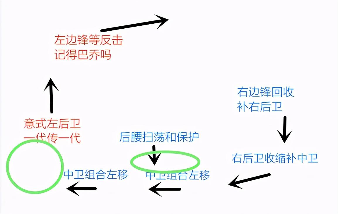 意大利链式来源于古典区域防守。当时一般DL提前配合ML反击,MR回收,配合2个DC1个DR组成人盯人,一个清道夫站在防线后。