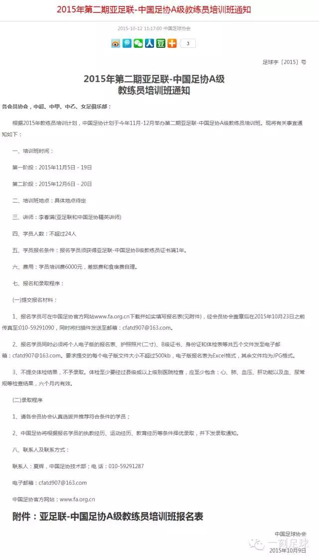 关于教练员培训班的信息,在足协官网的公开资料中可以看到,如A级教练员培训通知: