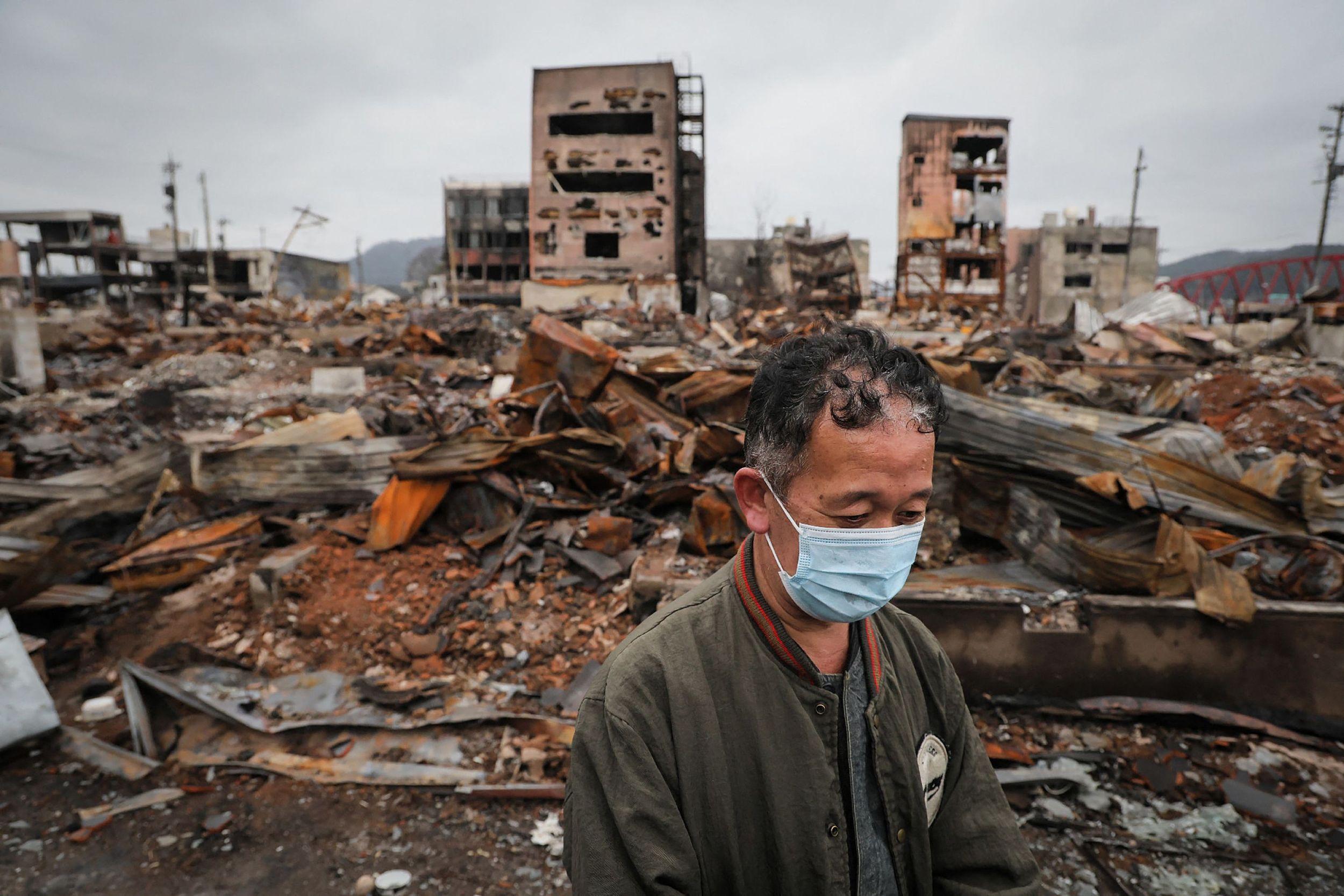 当地时间2024年2月1日,日本石川县轮岛市,能登半岛地震一个月后,一名男子站在被大火烧毁的房屋前。