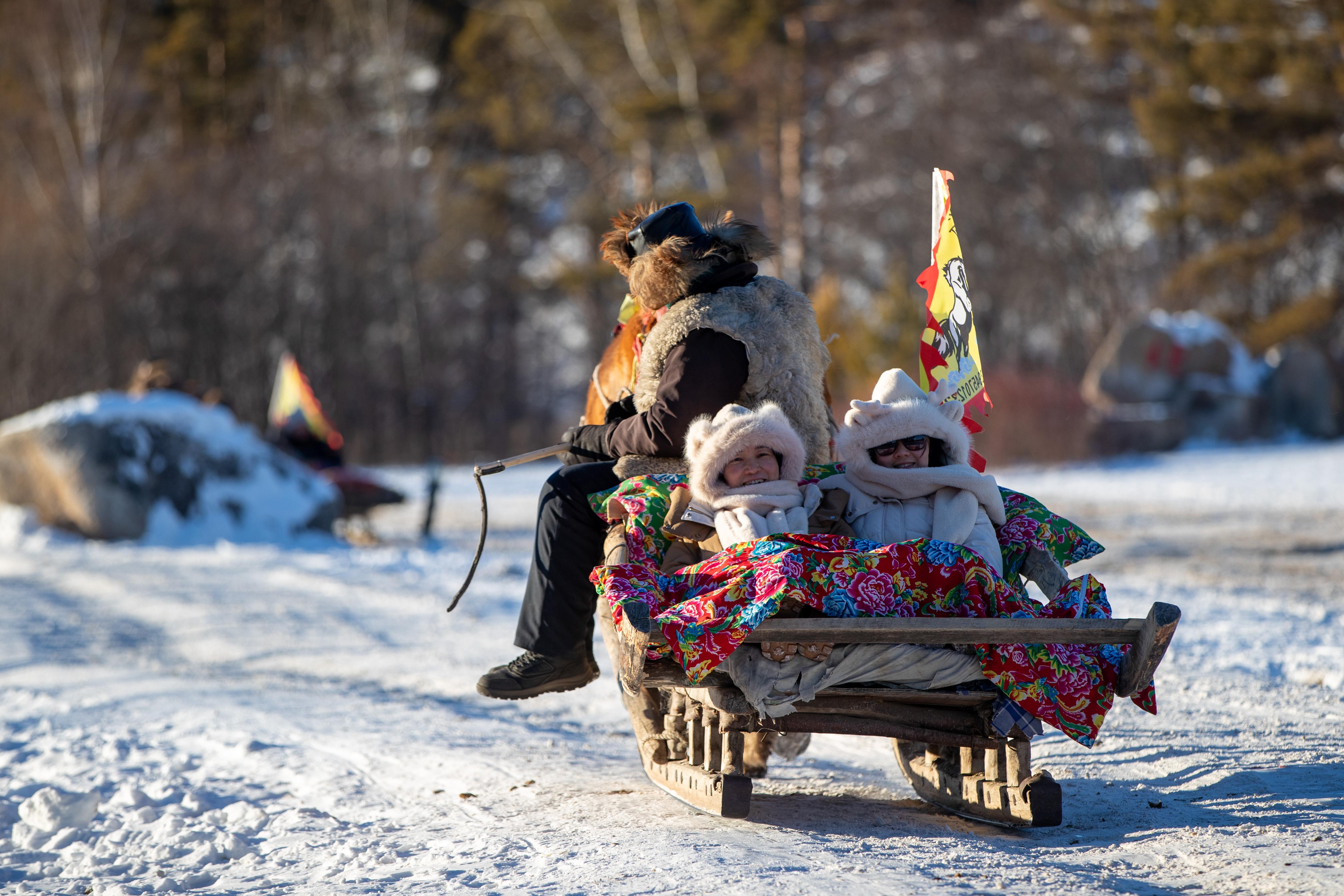2024年2月2日,黑龙江省,游客在漠河市北极村乘坐马拉爬犁。