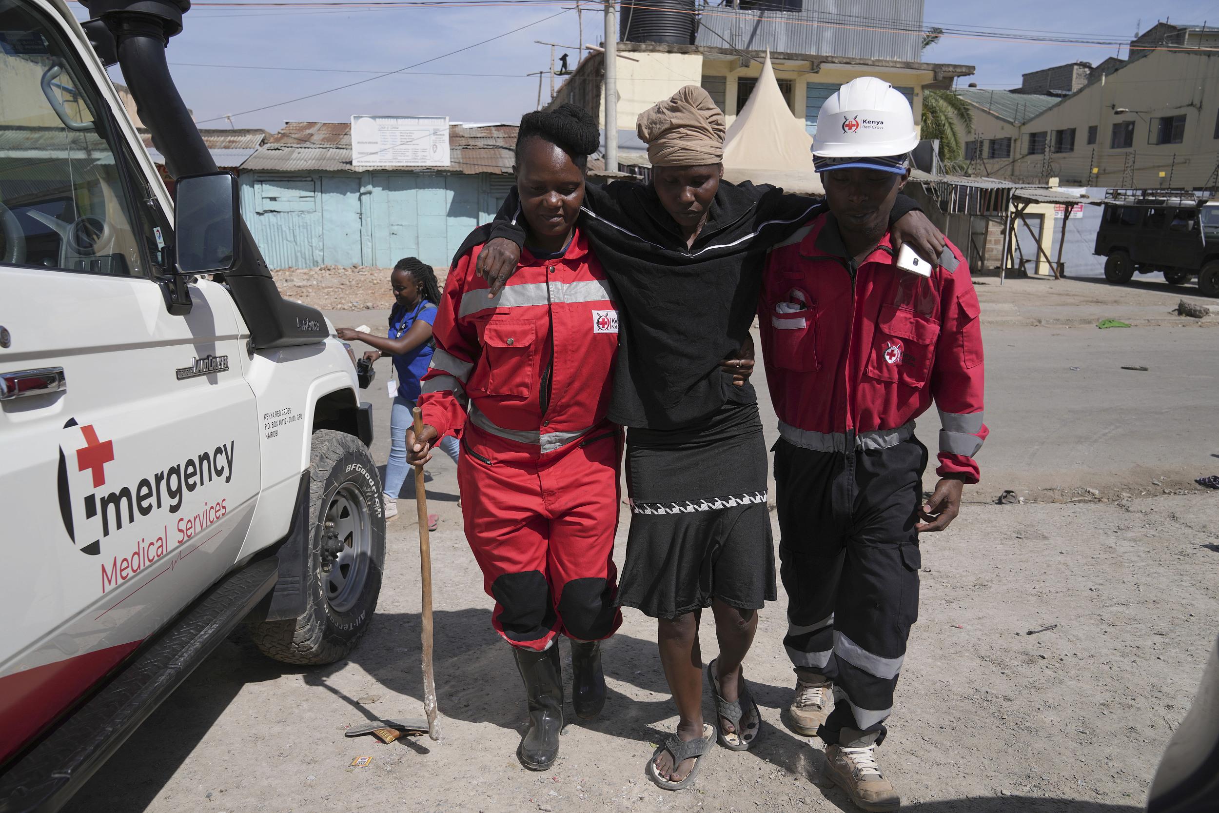 当地时间2024年2月2日,肯尼亚内罗毕,一名受伤的妇女在红十字会工作人员的帮助下被送往救护车。