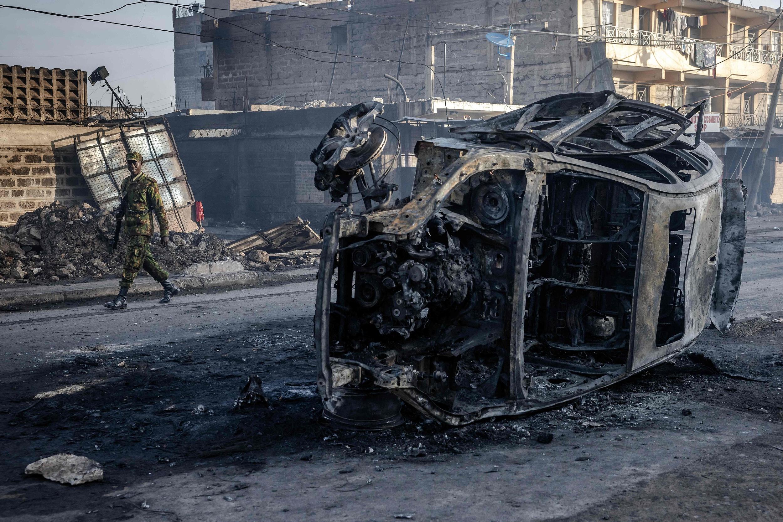 当地时间2024年2月2日,肯尼亚内罗毕,Embakasi地区发生瓦斯爆炸,一名肯尼亚警察走过一辆被烧毁的汽车。
