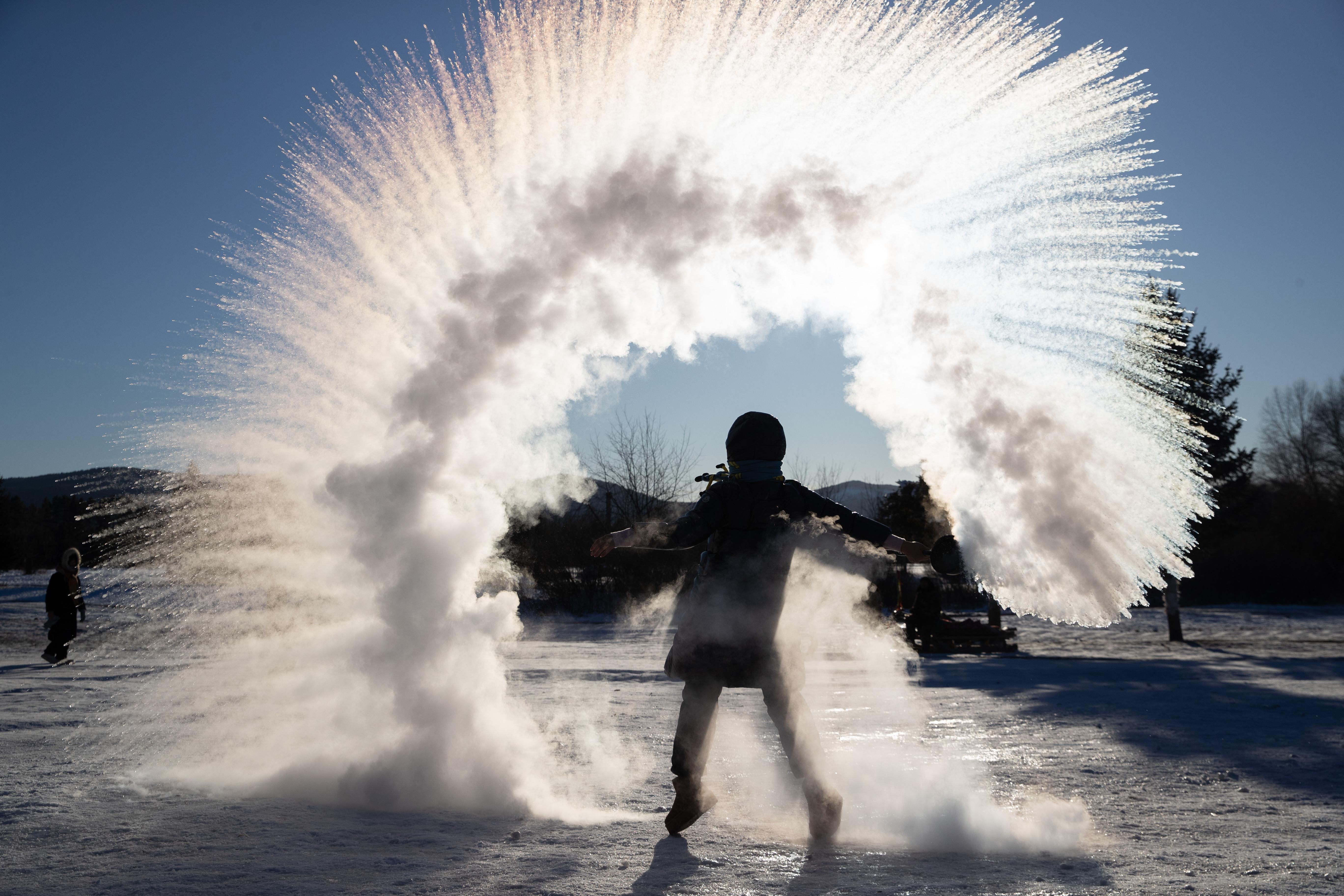2024年2月2日,黑龙江省,游客在漠河市北极村体验“泼水成冰”。