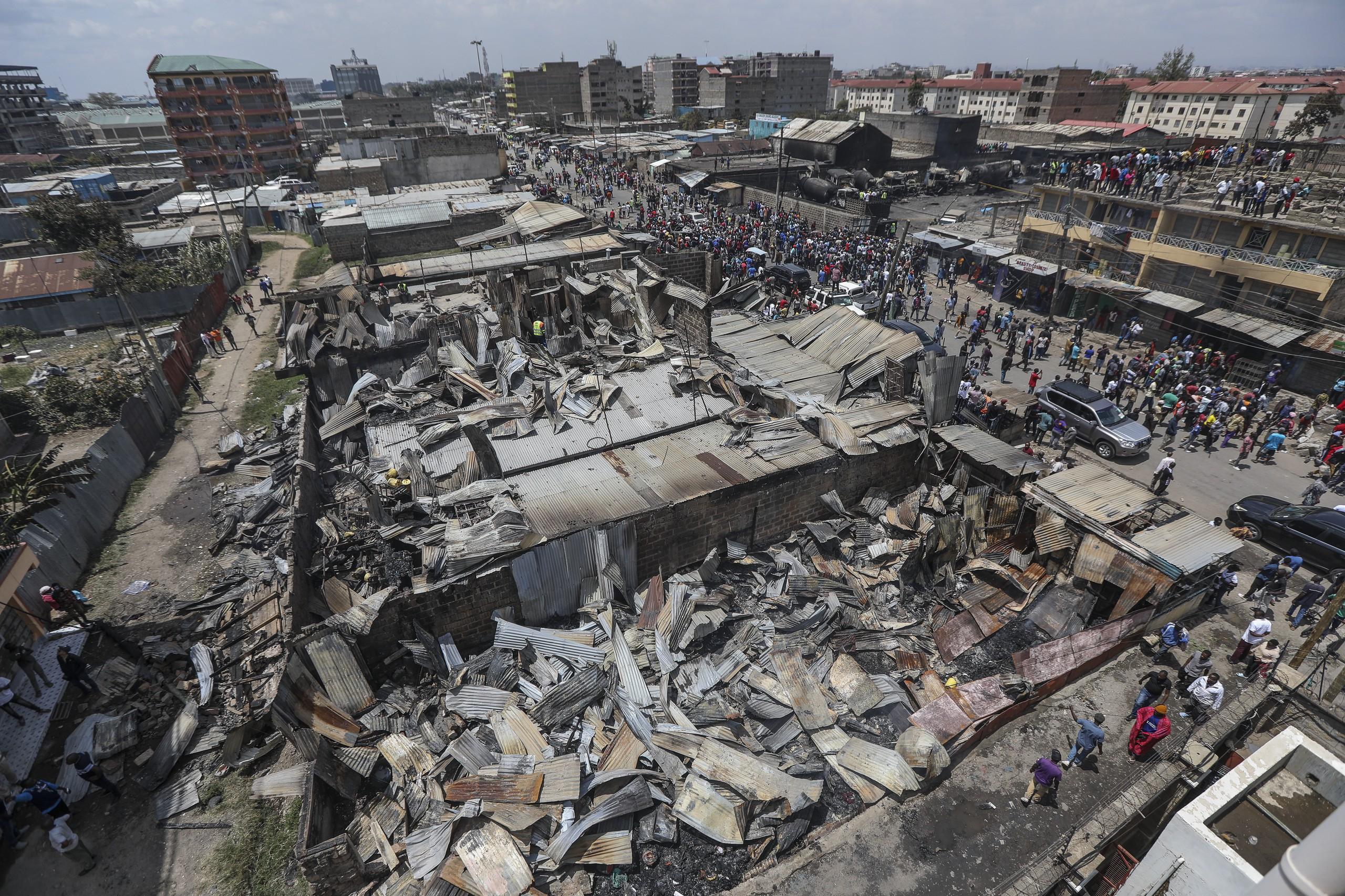 当地时间2024年2月2日,肯尼亚内罗毕,Embakasi地区发生瓦斯爆炸,人们聚集在被烧毁的房屋和商店附近。