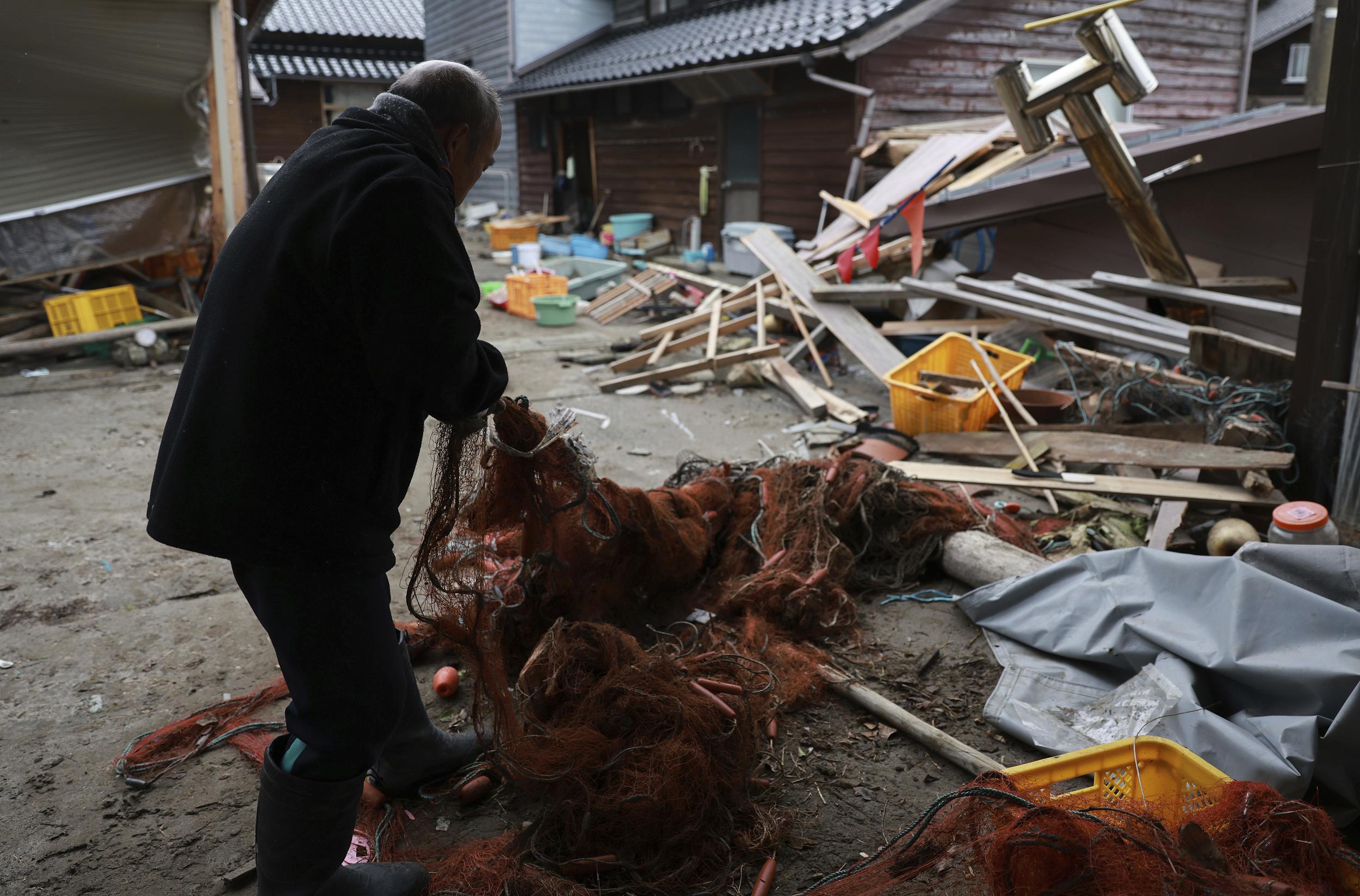 当地时间2024年2月2日,日本石川县珠洲市,一名渔民在遭受大地震和海啸袭击的受灾地区清理渔具。