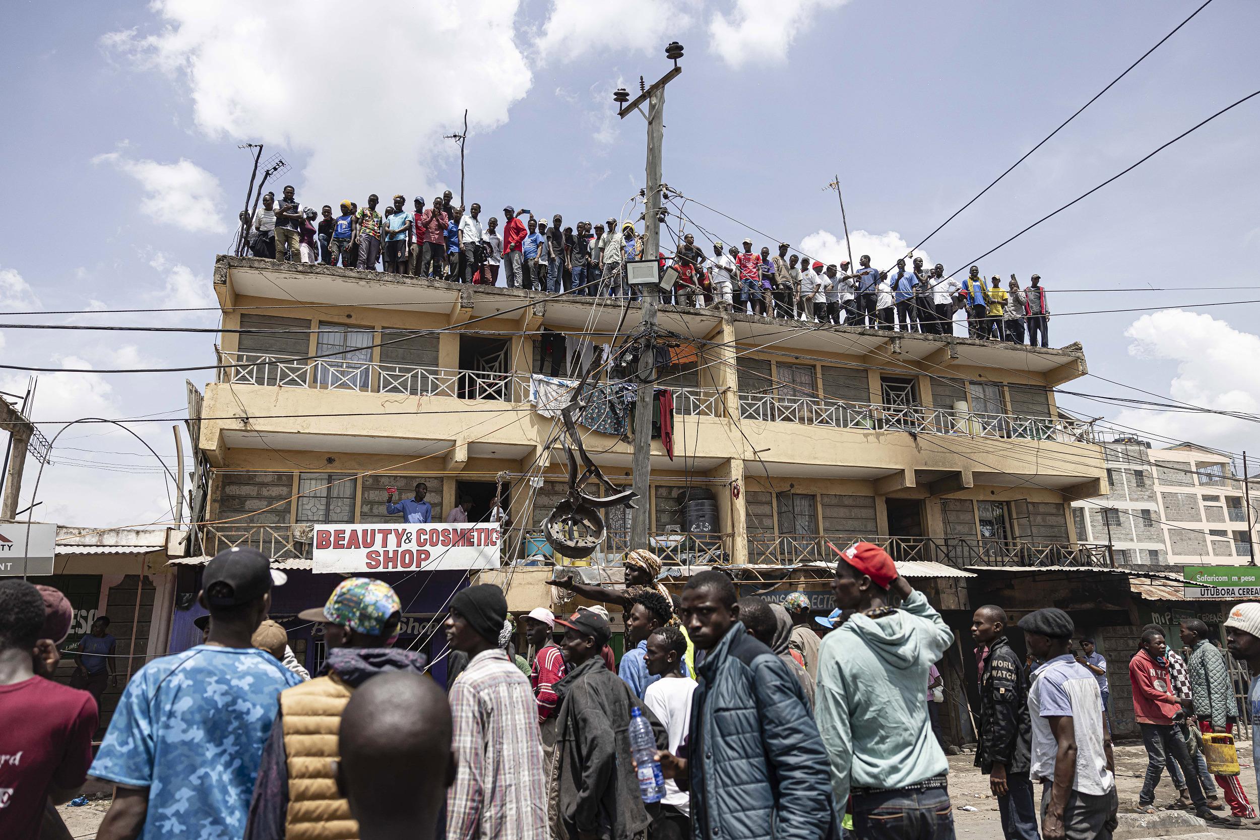 当地时间2024年2月2日,肯尼亚内罗毕,Embakasi地区发生爆炸,人们站在受损的建筑物屋顶上。