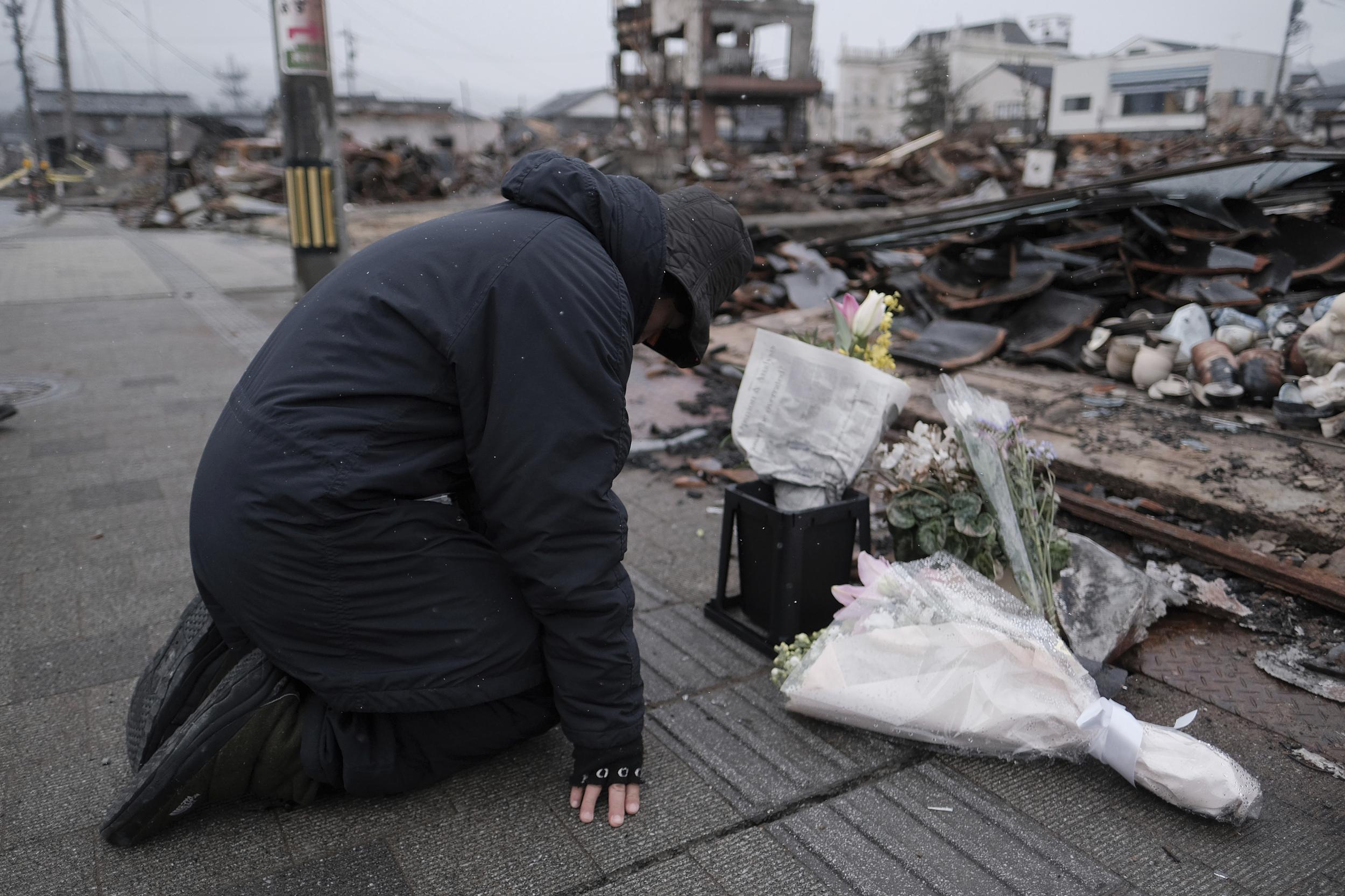 当地时间2024年2月1日,日本石川县轮岛市,能登半岛地震的幸存者和遇难者家属正在为地震受害者默哀。