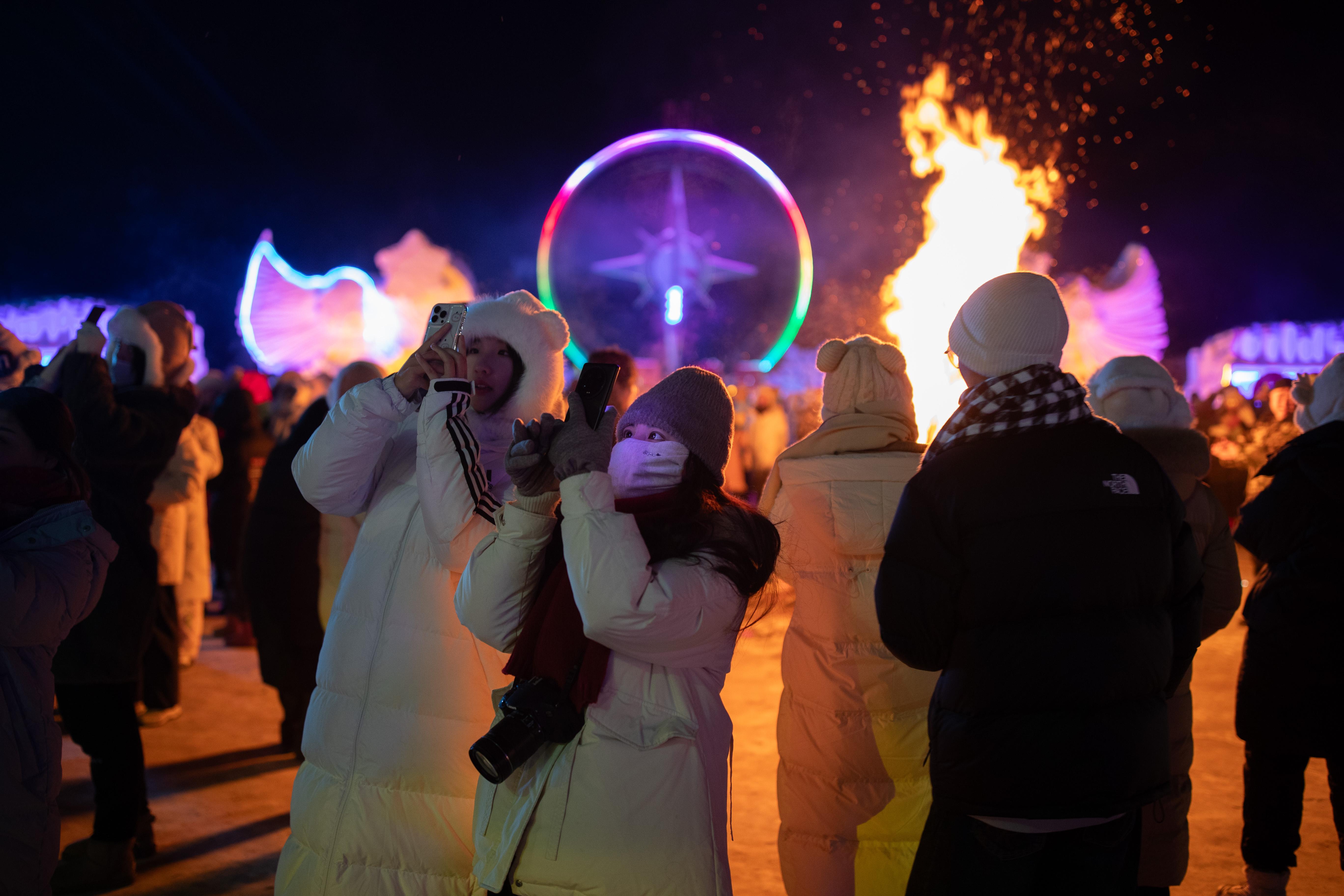 2024年2月2日,黑龙江省,游客在漠河市北极村拍照。