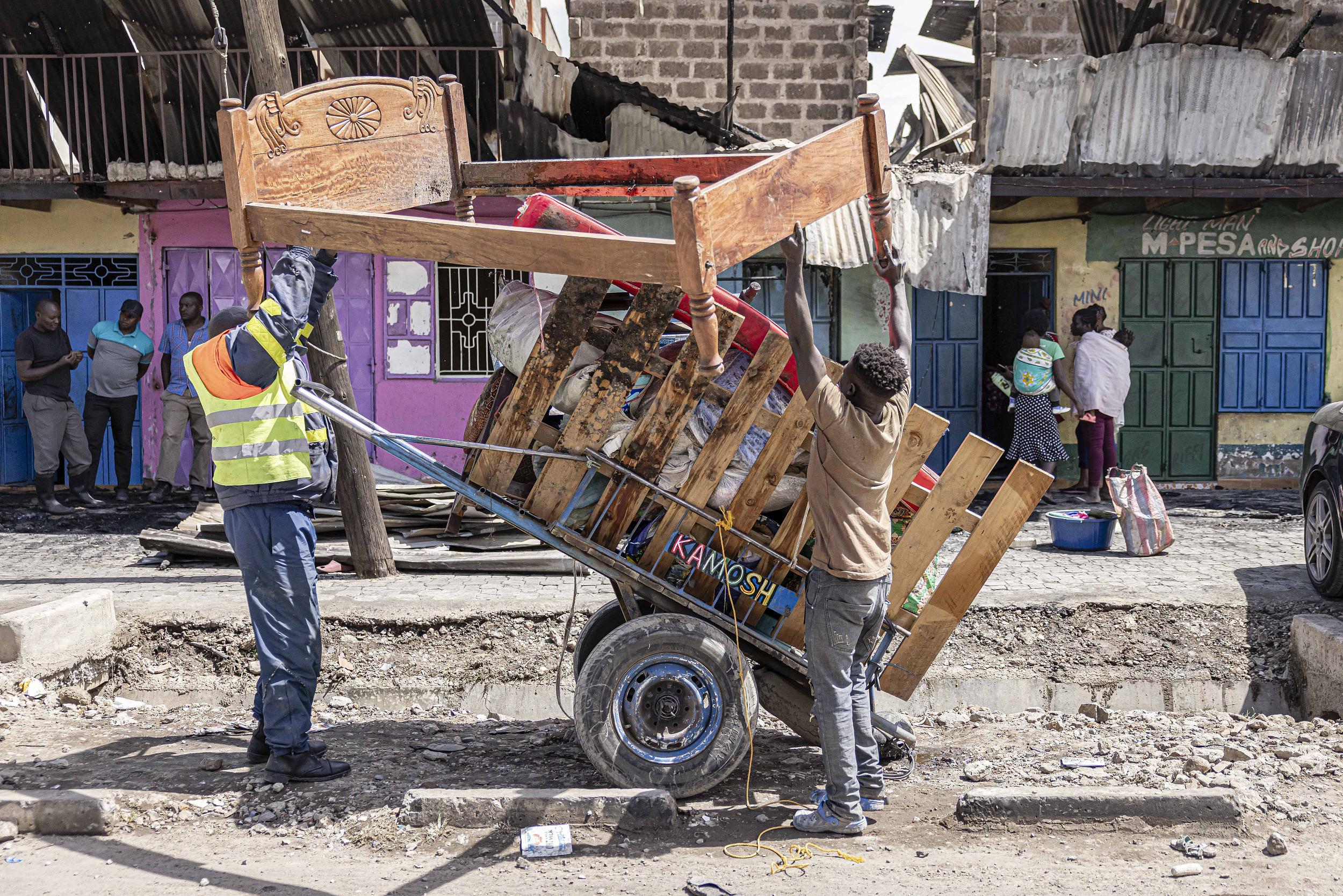 当地时间2024年2月2日,肯尼亚内罗毕恩姆巴卡西区,居民从爆炸后受损的建筑物中打捞财物。