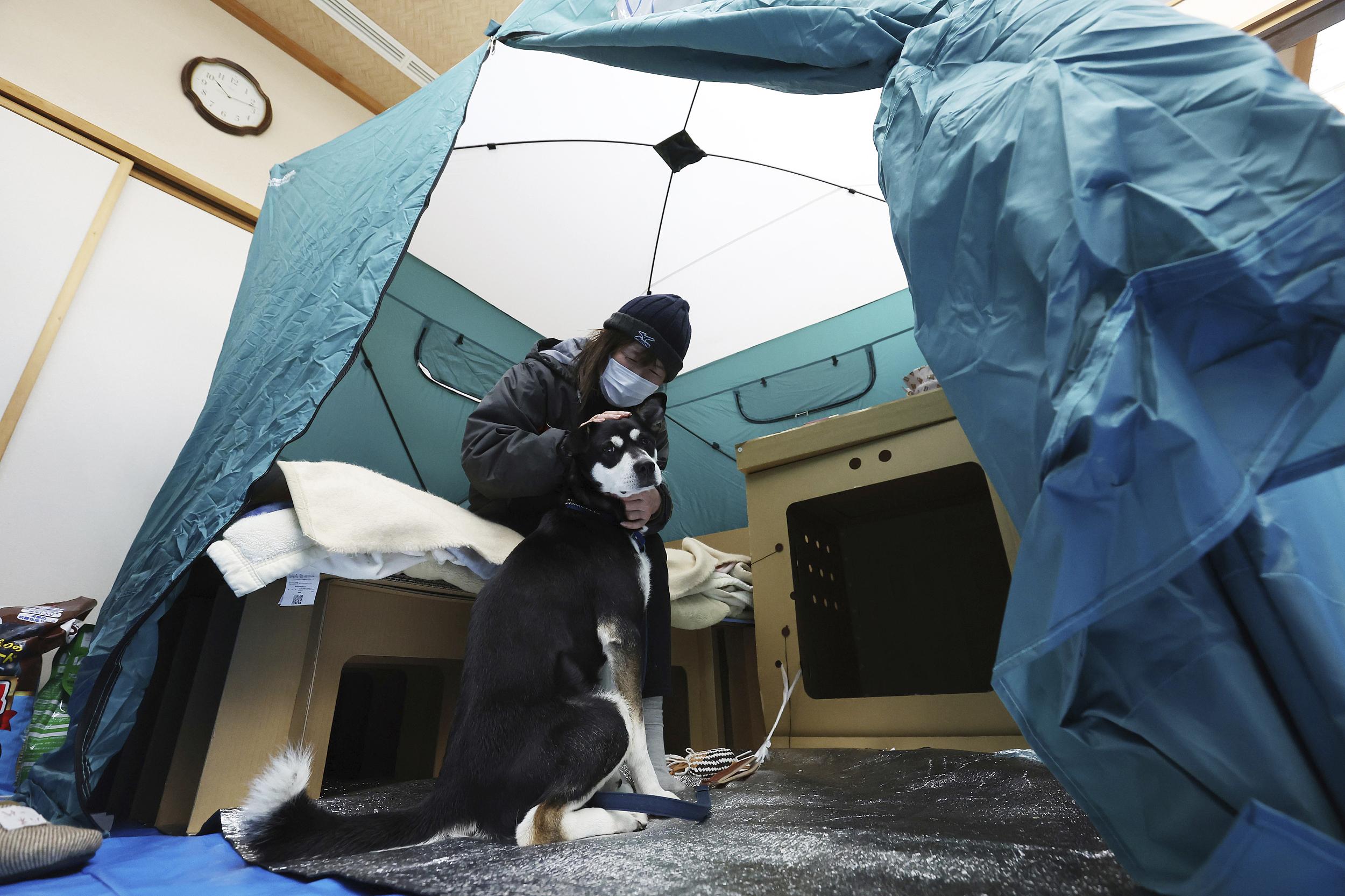 当地时间2024年2月1日,日本石川县珠洲市,灾民和她的狗住在一个帐篷里。