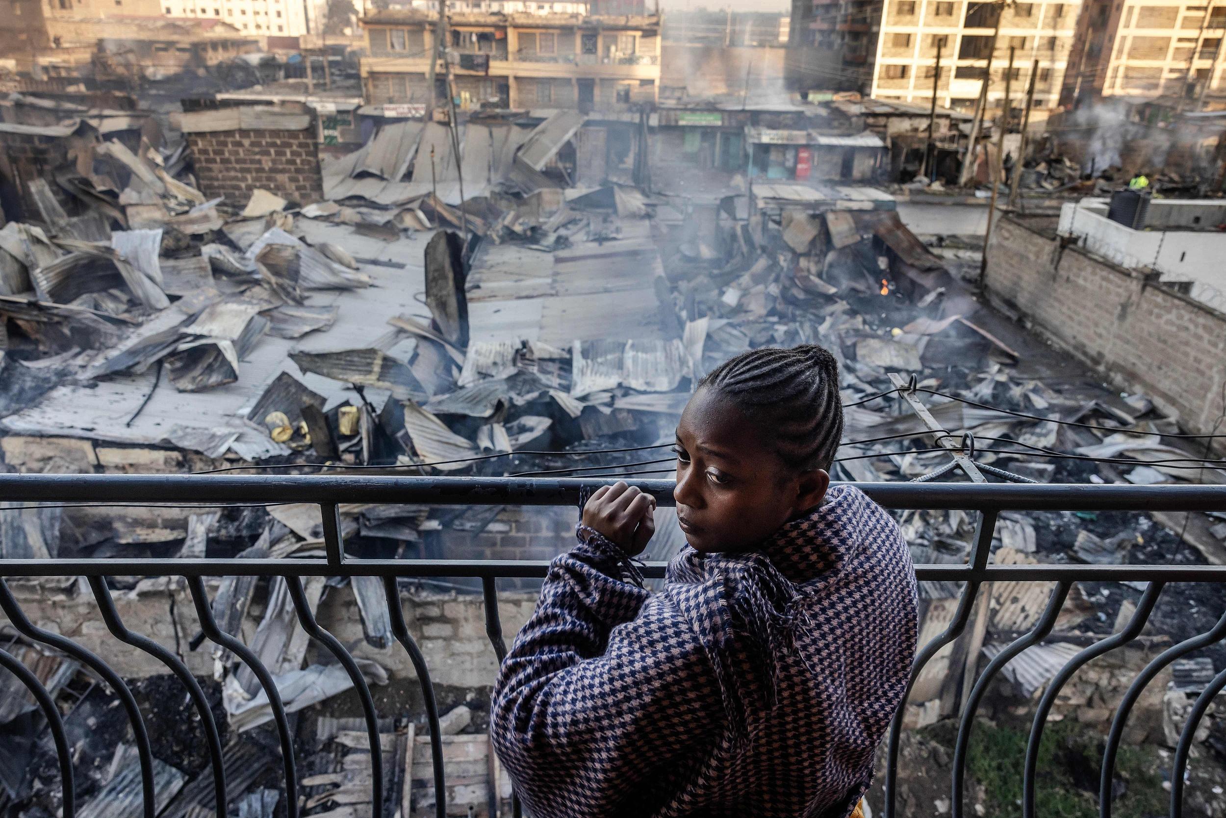当地时间2024年2月2日,肯尼亚内罗毕,一名妇女从阳台上看着严重受损的房屋和商店。