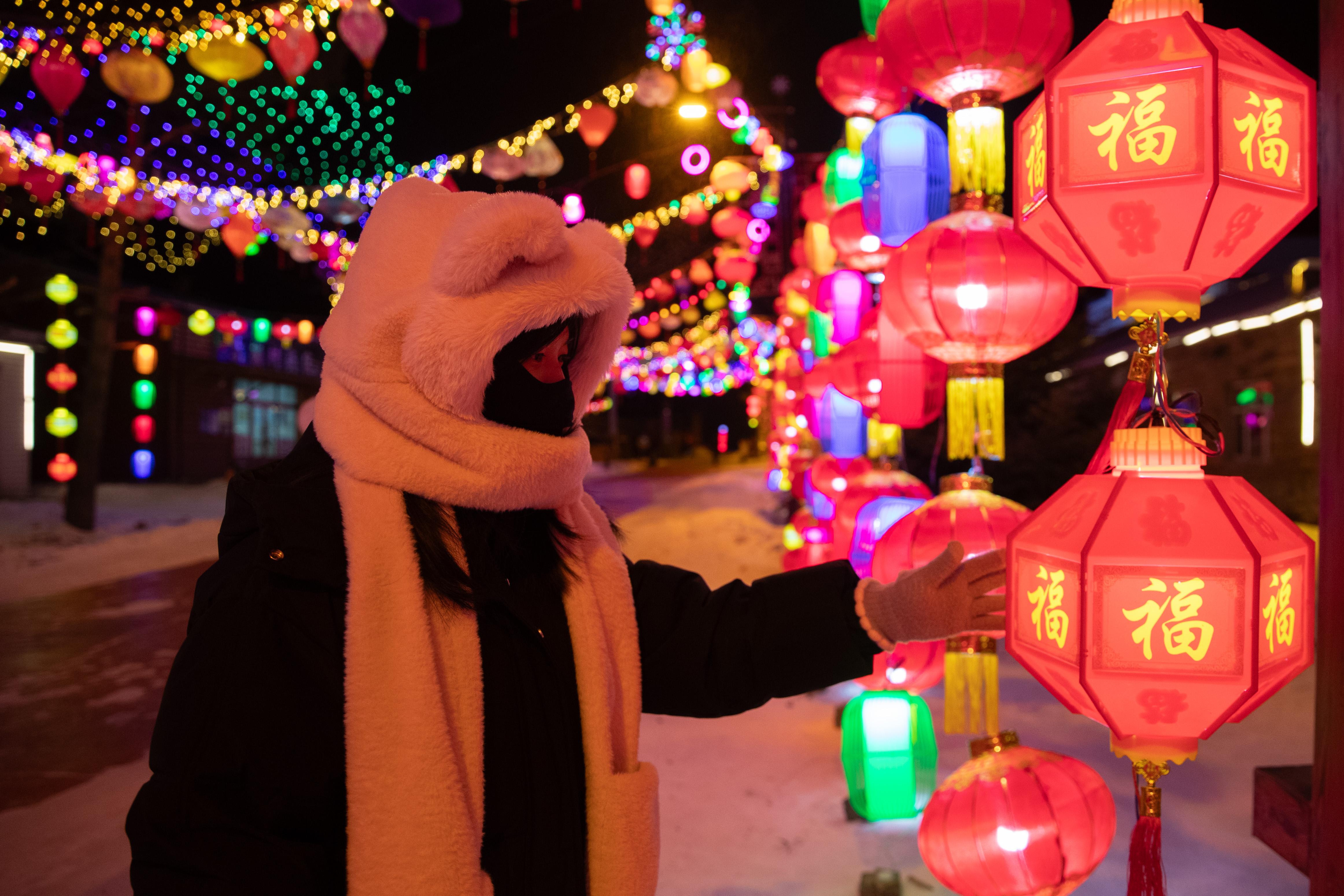2024年2月2日,黑龙江省,游客在漠河市北极村内赏灯。