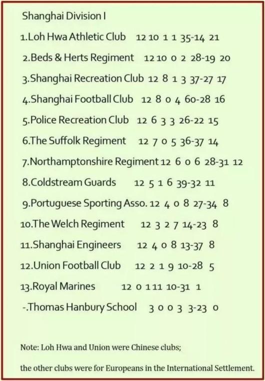 20世纪20年代上海租界足球联赛的一份年度排名简报