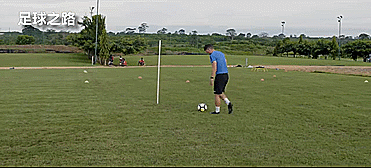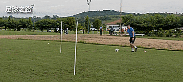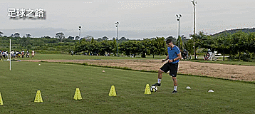 接下来我们要练习的是齐达内转身,这是一个斜向摆脱的足球技巧,我们在比赛中经常遭遇1v1,我们不得不摆脱防守,所以当我们接近标志盘的时候,要把它们当作侧面过来逼抢的防守队员。