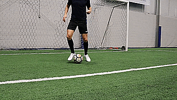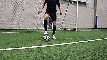我们还可以加入一些变化,不是拉球转身,而是先向前触球,然后回拉,再用另一只脚的脚后跟触球,随后转身向前。