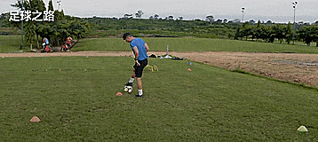 最后一个技巧我们叫做他身后回拉,或者L型拉球,这也是一个斜向过人技巧,我们先带球朝向标志盘,快接近防守队员的时候,我们用脚底将球回拉,然后脚内侧触球从支撑腿后拨球,最后用另一只脚触球摆脱。