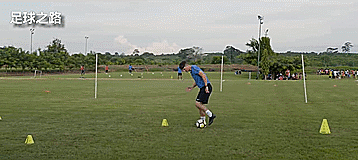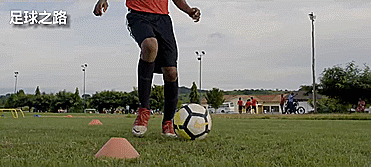在做完这个动作以后,有一点非常重要,那就是要大步触球,记住标志盘就是防守队员,我们要触球快速爆发摆脱防守,然后继续带球或者传球。