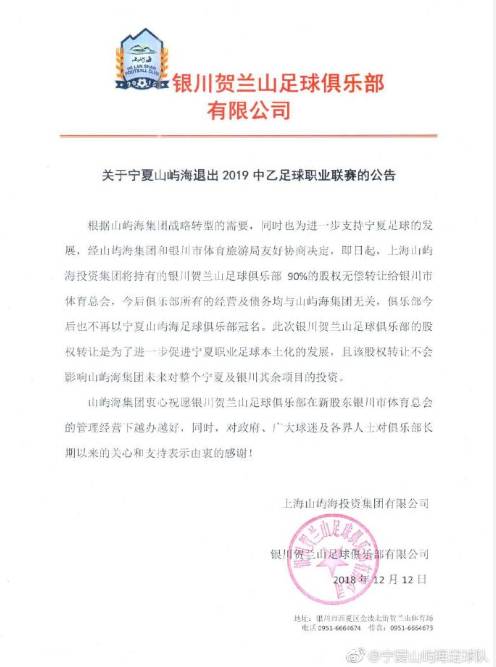 直播吧12月12日讯 今天宁夏山屿海集团宣布退出2019年中乙联赛,将上海山屿海投资集团将持有的银川贺兰山足球俱乐部90%的股权无偿转让给银川市体育总会。