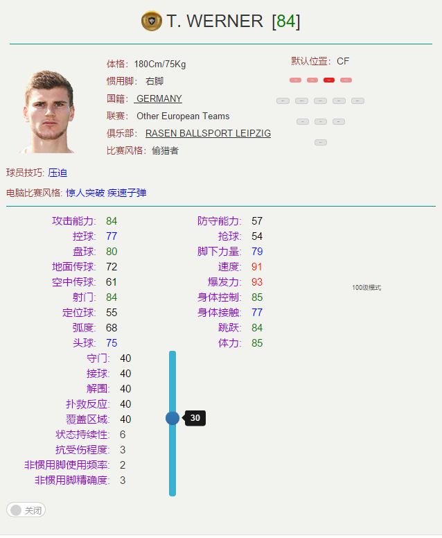游戏中的维尔纳是现版本中著名的妖人,确定下赛季升黑后更是吸引了大量玩家使用。作为速度型前锋的代表人物之一,其特点与欧文类似,但速度更快(速度91,爆发93),84的射门也已足够,并且拥有更好的对抗性(身体控制85、身体接触77)。