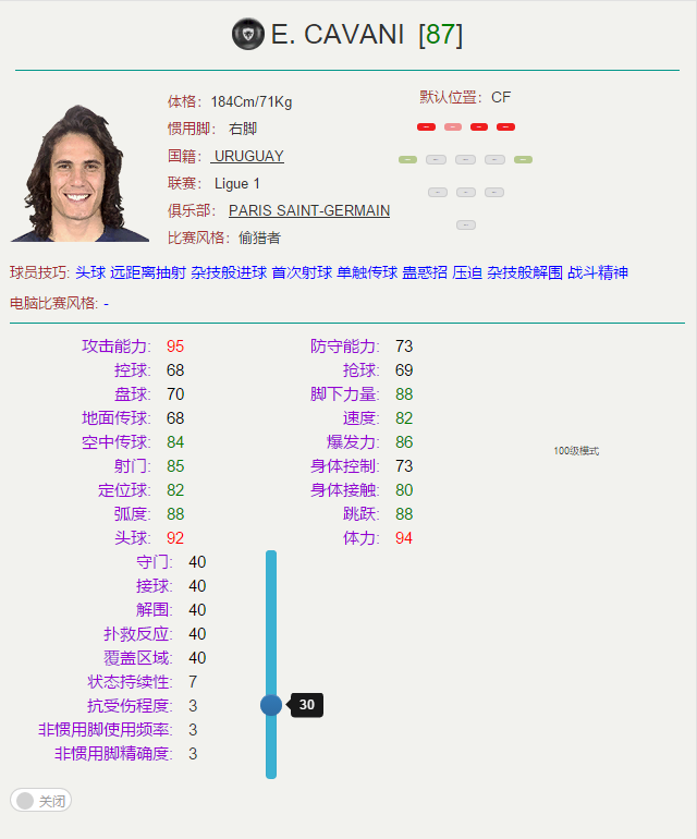 卡瓦尼的缺点也同样鲜明,73的身体控制注定了他不是一名灵动的前锋。而作为支点,拿不住球(控球68、盘球70)是很多玩家所诟病的一点;虽然拥有单触传球技巧,但68的地面传球显然不够看。因此,卡瓦尼更适合双前锋打法,搭配一名盘控出色具有出球能力的前锋作为搭档,单纯将卡瓦尼作为进攻终结者使用更佳!