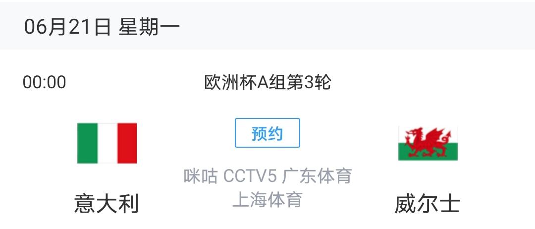 意大利vs威尔士比赛直播时间:6月20日23:59