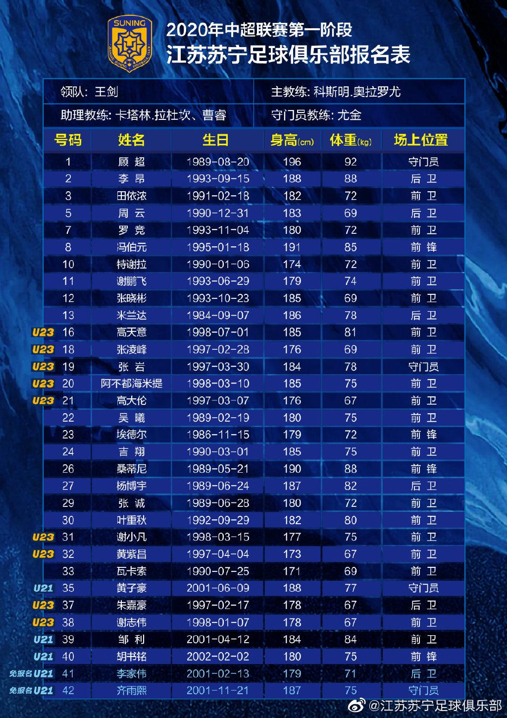 苏宁一线队第一阶段名单中,共包括14名U23球员,其中U21球员多达5人。具体名单: