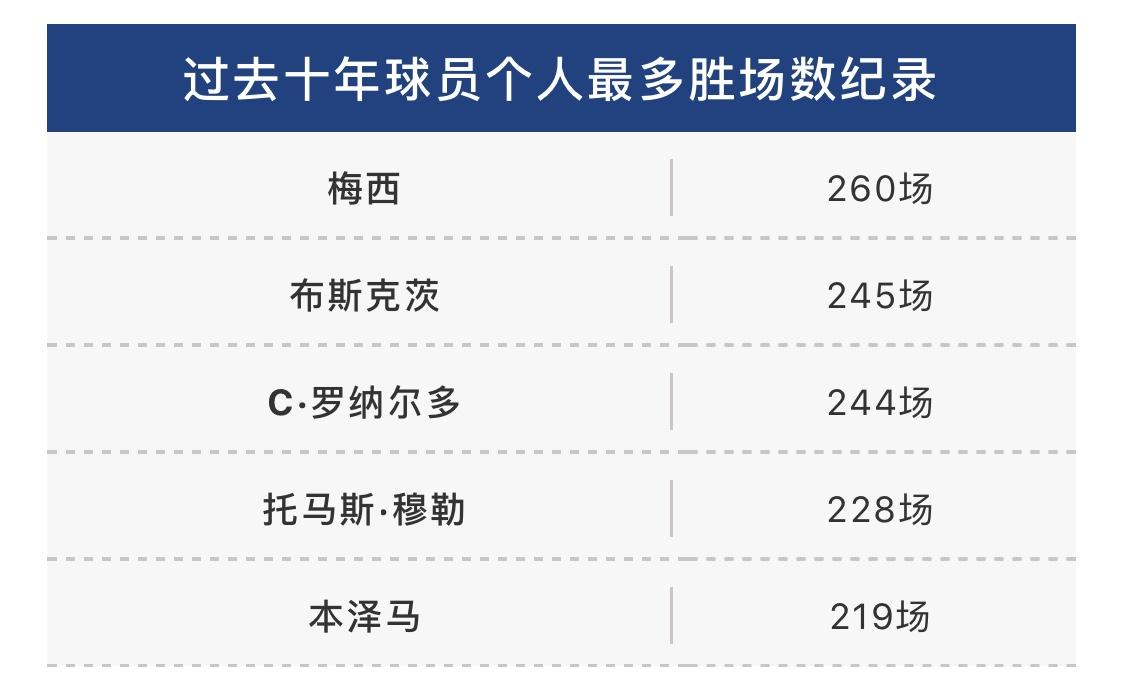 在这十年间,梅西跟随球队完成了西甲“大通关”。对阵34个西甲对手,梅西全部取得过胜利, 并以个人260场胜利的战绩,成为五大联赛收获胜场数最多的球员。