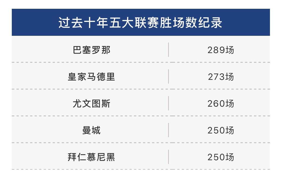 2010到2019年间,巴萨以289场联赛胜利登顶五大联赛球队之最。 同时,面对34个西甲联赛对手,红蓝军团全部取得过胜利,绝无幸存者。此外,巴萨在过去十年间,七次夺得联赛冠军,制霸西甲。