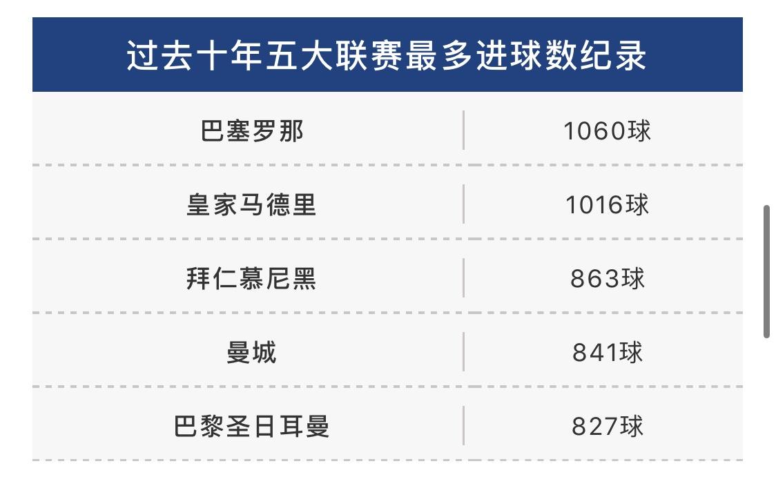过去十年,巴萨是进攻火力最猛的球队,总共打进1060个进球 ,放眼五大联赛,没有第二支球队可以相匹敌。