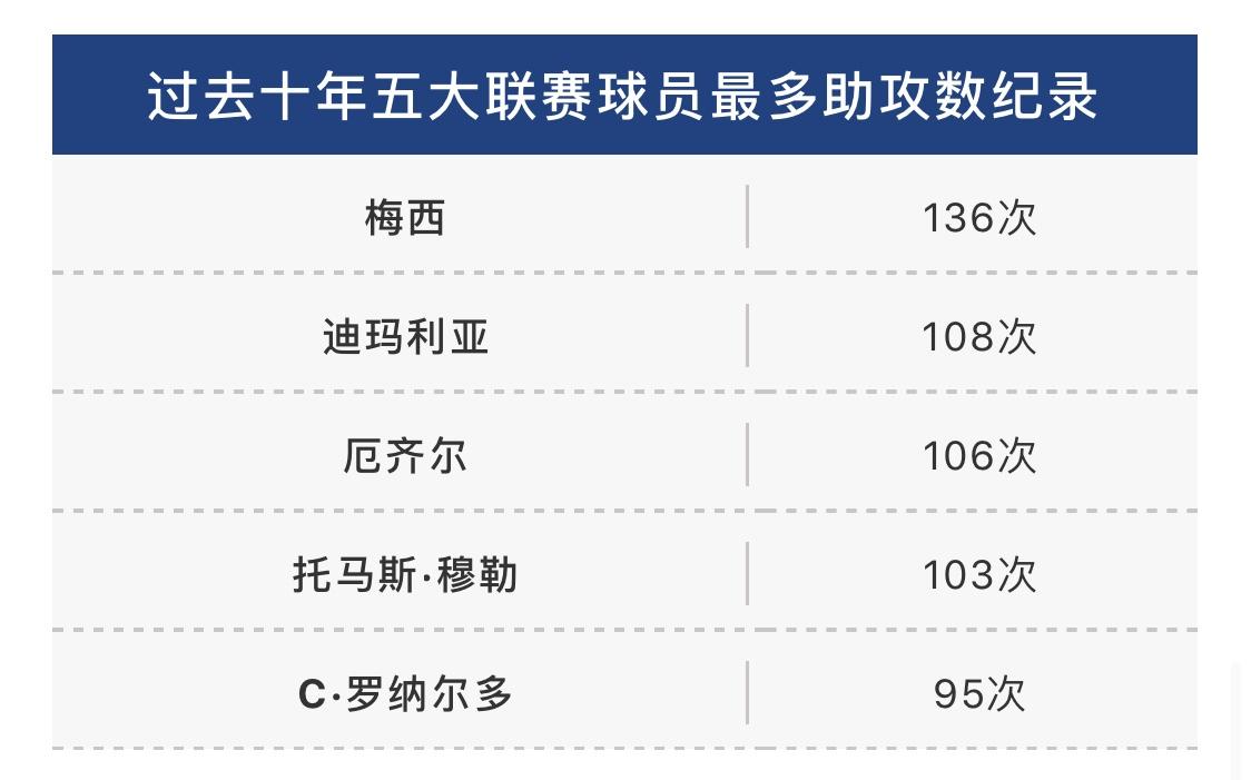 除了进球效率惊人,梅西最可怕之处在于他还有着非凡的助攻能力。过去十年间,梅西一共收获136次助攻,是五大联赛的助攻王 。