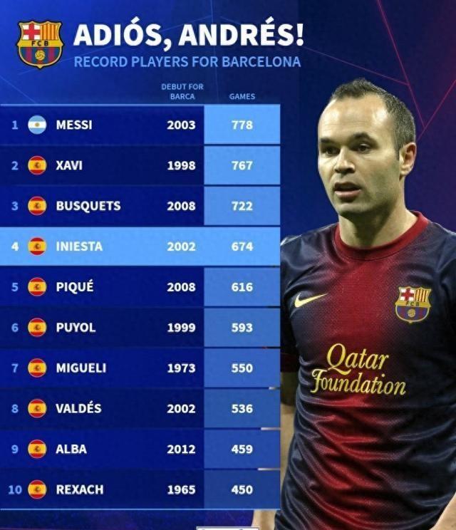巴萨队史出场榜:梅西778场居首&哈维次席,伊涅斯塔674场第四