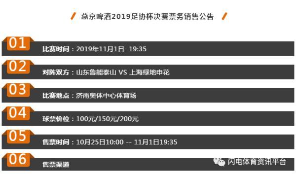根据双方俱乐部的协商,2019足协杯决赛上海绿地申花对阵山东鲁能的两回合比赛,双方将对等接待1000名客队球迷,票价为50元/张。