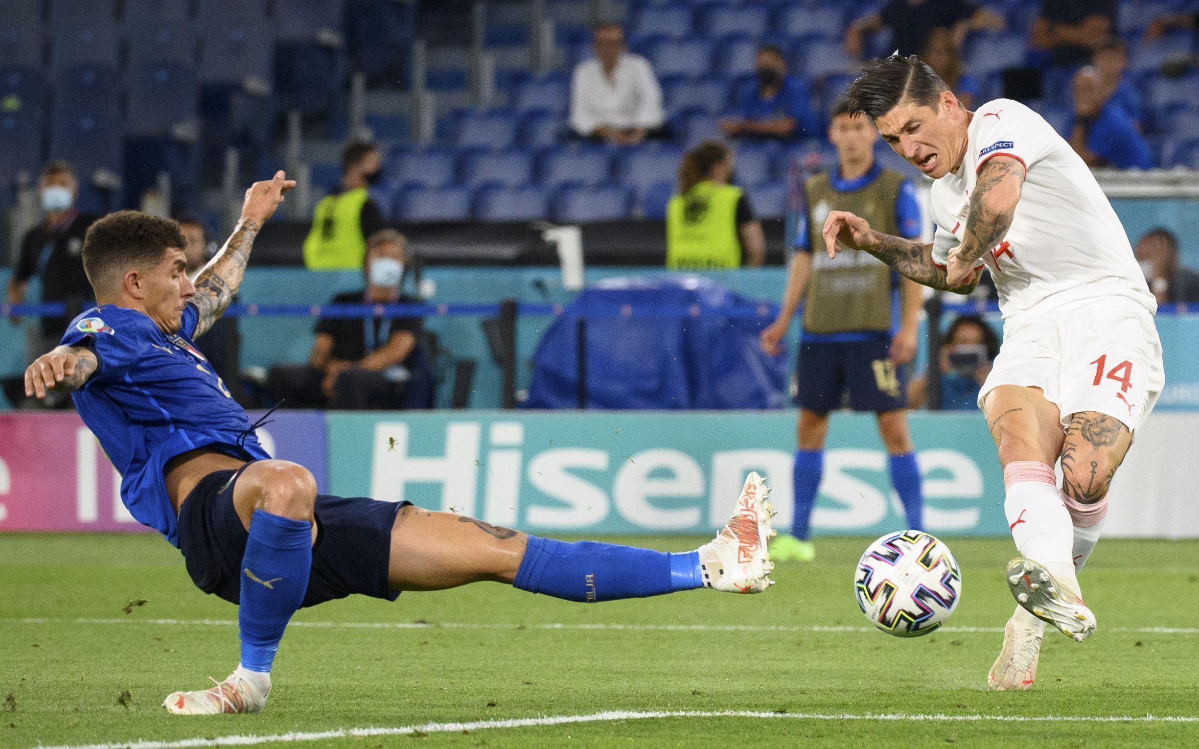 意大利后卫迪洛伦佐(左)积极防守,上一轮他们3比0完胜瑞士。图/IC PHOTO