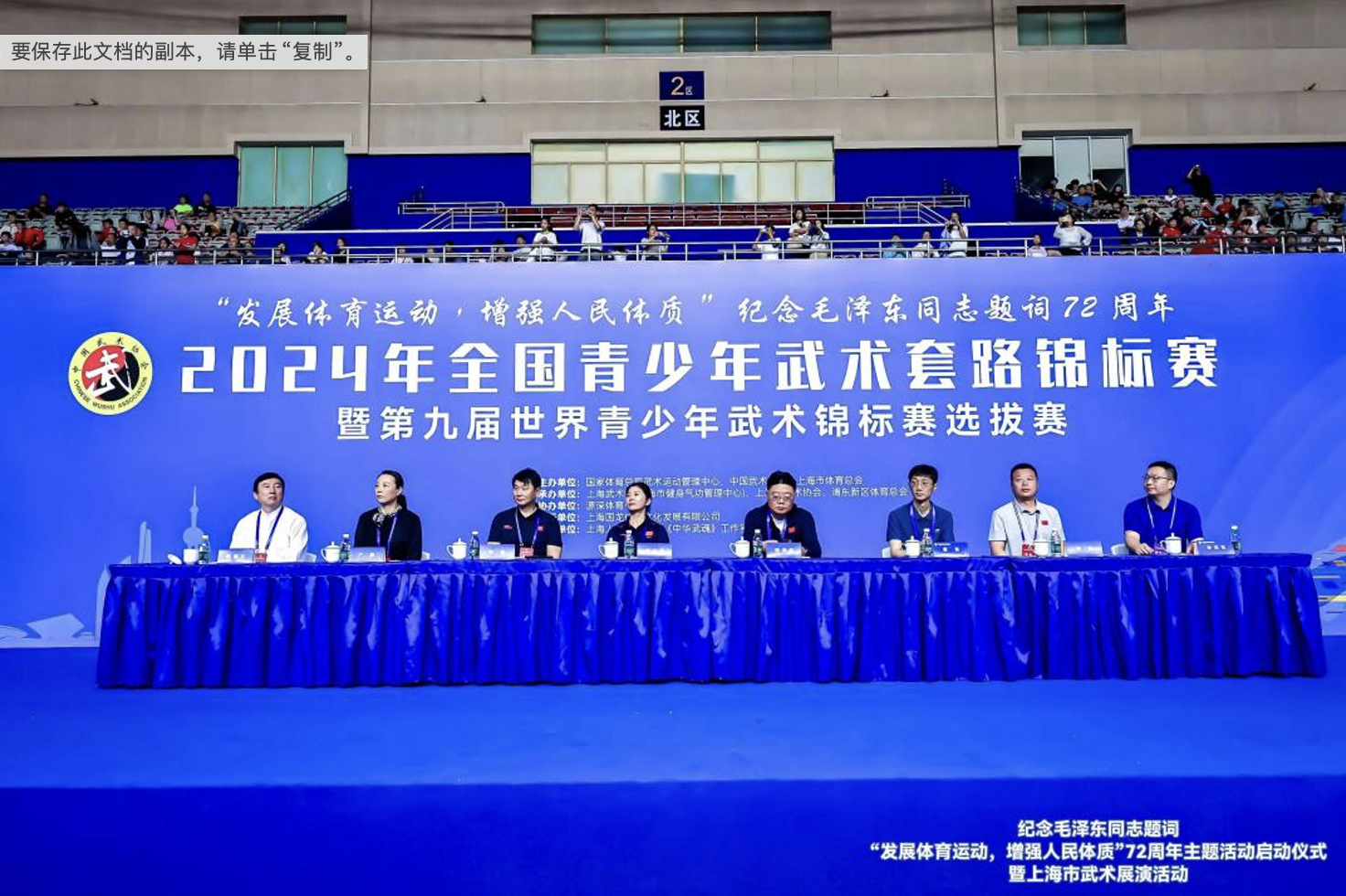 北京时间6月8日,纪念毛泽东同志题词“发展体育运动,增强人民体质”72周年主题活动启动仪式暨上海市武术展演活动在源深体育馆隆重举行。