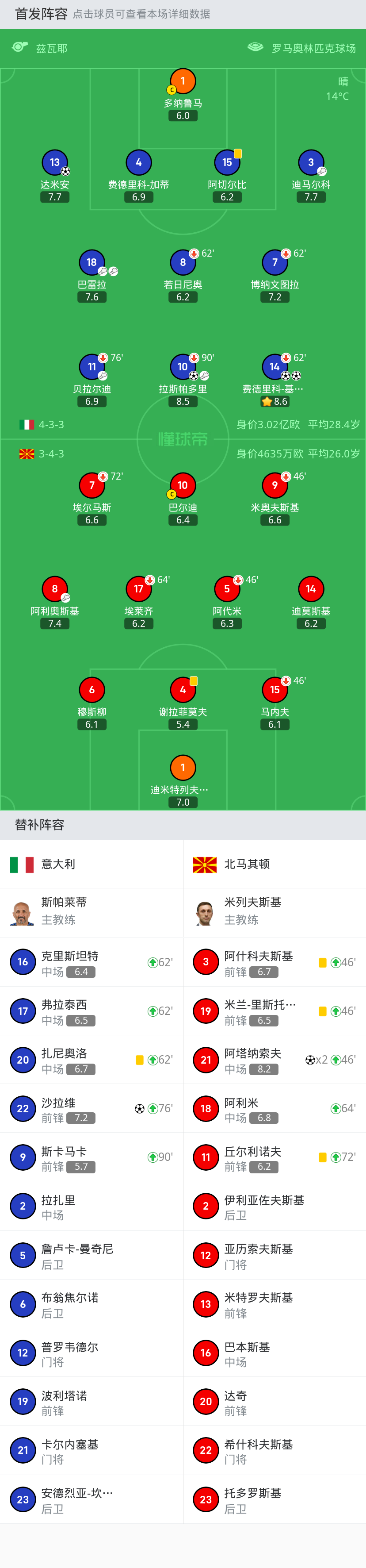 意大利首发: 17-因莫比莱, 2-迪洛伦佐, 16-克里斯坦特, 7-波利塔诺, 3-迪马尔科, 20-扎卡尼, 18-巴雷拉, 14-詹卢卡-曼奇尼, 1-多纳鲁马, 23-巴斯托尼, 8-托纳利