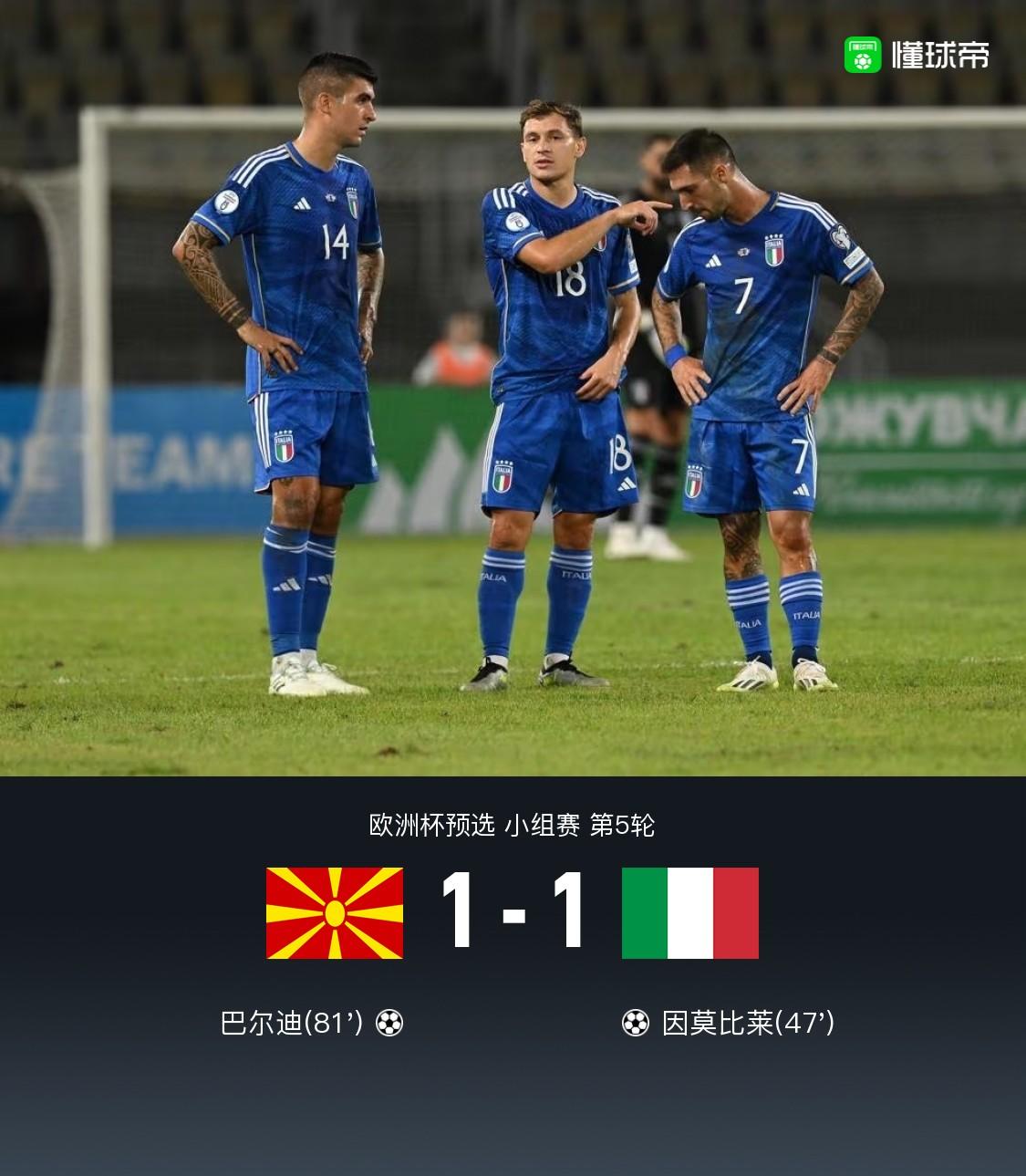 北京时间9月10日欧洲杯预选小组赛第5轮展开一场焦点战役,北马其顿主场对阵意大利。上半场,托纳利单刀射门击中立柱弹出。下半场,巴雷拉抽射击中横梁,因莫比莱头球补射得分。比赛尾声阶段,北马其顿获得前场任意球,巴尔迪直接射门皮球窜入死角。全场比赛结束,意大利1-1客平北马其顿,未能报世界杯附加赛被对手淘汰的一箭之仇。