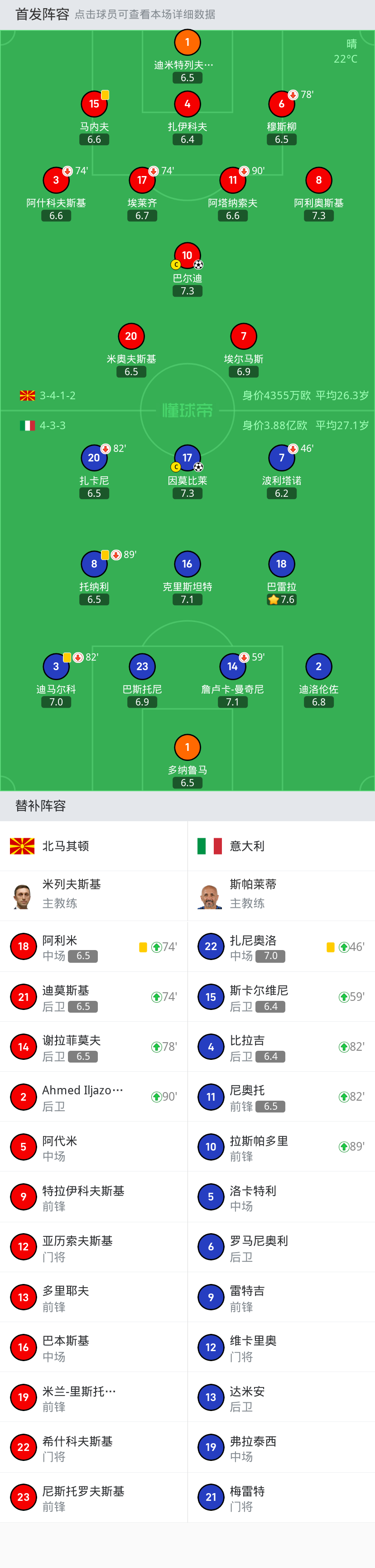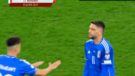 意大利首发:21-多纳鲁马、16-弗洛伦齐、19-詹卢卡-曼奇尼(88’3-基耶利尼)、23-巴斯托尼、13-埃莫森、18-巴雷拉(76’4-托纳利)、8-若日尼奥、6-维拉蒂、11-贝拉尔迪(88’9-若奥-佩德罗)、17-因莫比莱(76’7-洛伦佐-佩莱格里尼)、10-因西涅(63’22-拉斯帕多里)