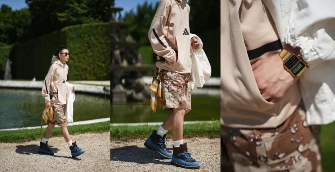 整体风格将户外、工装、运动风混搭在一起,同样有很好的效果。