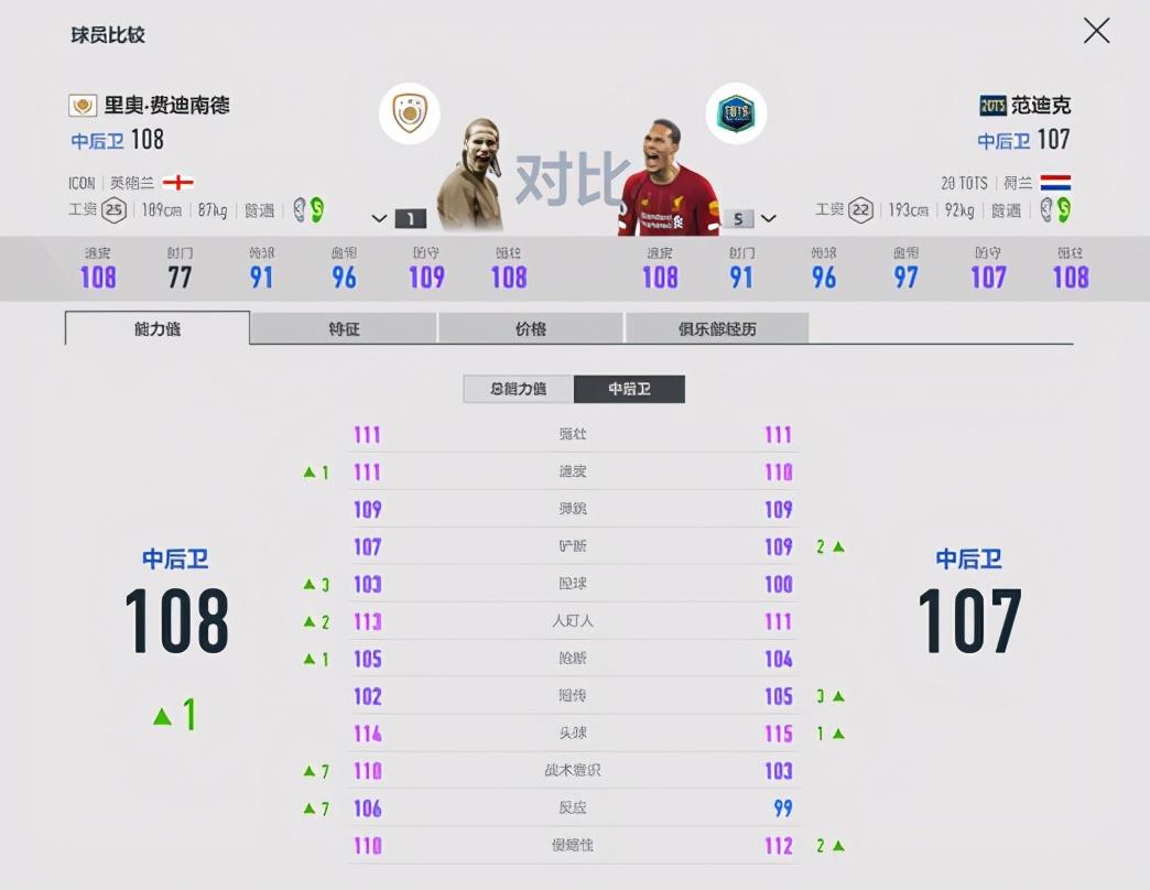 就数据面板而言,我们可以看到在速度以及身体强壮上两者可以说是平分秋色,在头球能力上两者也是不相上下。传球以及盘带能力,范迪克要略微高于费迪南德。在防守能力上,费迪南德要略高于范迪克。 身形上,两者都是高大的中后卫。