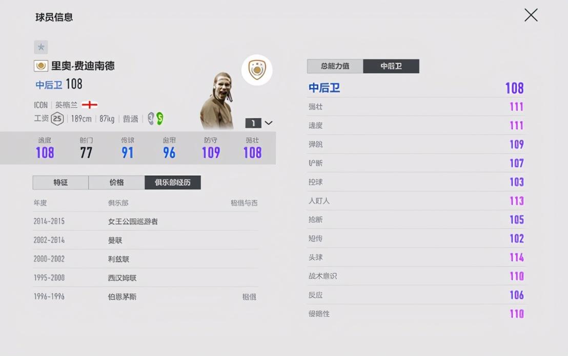 我们难以忽视费迪南德高达111的强壮,110的侵略性。仅有一颗侵略的心,没有身体做保障,那也只能是鸡蛋碰石头。相反,如果有强壮的身体,那侵略性极高的费迪南德会在赛场上积极拦截,在球权的争夺上更加主动。 高达106的反应让费迪南德在拼抢时不至于脑子跟不上脚,下脚会更加精准,很少会出现所谓的“眼神防守”。