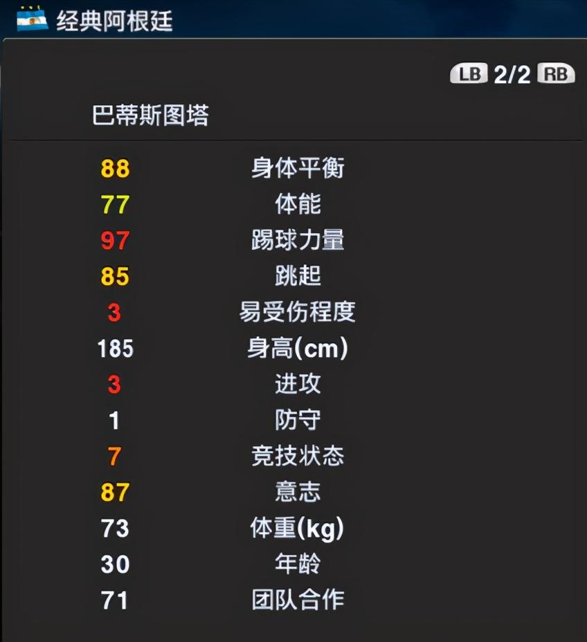 【关键数据值】:身高185,进攻99,头球91,射门精度93,力量97,反应95,逆足4,身体平衡88,盘带速度78,极限速度82。【实际效果】:优势 :虽然速度稍慢,但99的进攻力赋予了强悍的跑位意识,经常出现在传球的空挡。而且95的反应让他抢点非常强,经常抢在对方出脚之前打门。身高185和平衡88,让巴蒂有着完美的对抗能力,经常可以倚住对方后卫进行突破或者射门。头球也很不错,有时候一场比赛能进几颗头球。脚头很硬,崇尚大力射门,如果不是打飞和打进,基本很容易让守门员脱手,这时候就给了其他球员补射的机会,继续扩大比分。