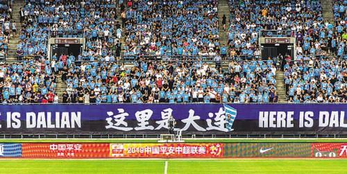 2019年7月,在大连人职业足球俱乐部支持下,大连市足球球迷协会组织新换30多幅看台标语,打造了浪漫文明的主场氛围。王华摄