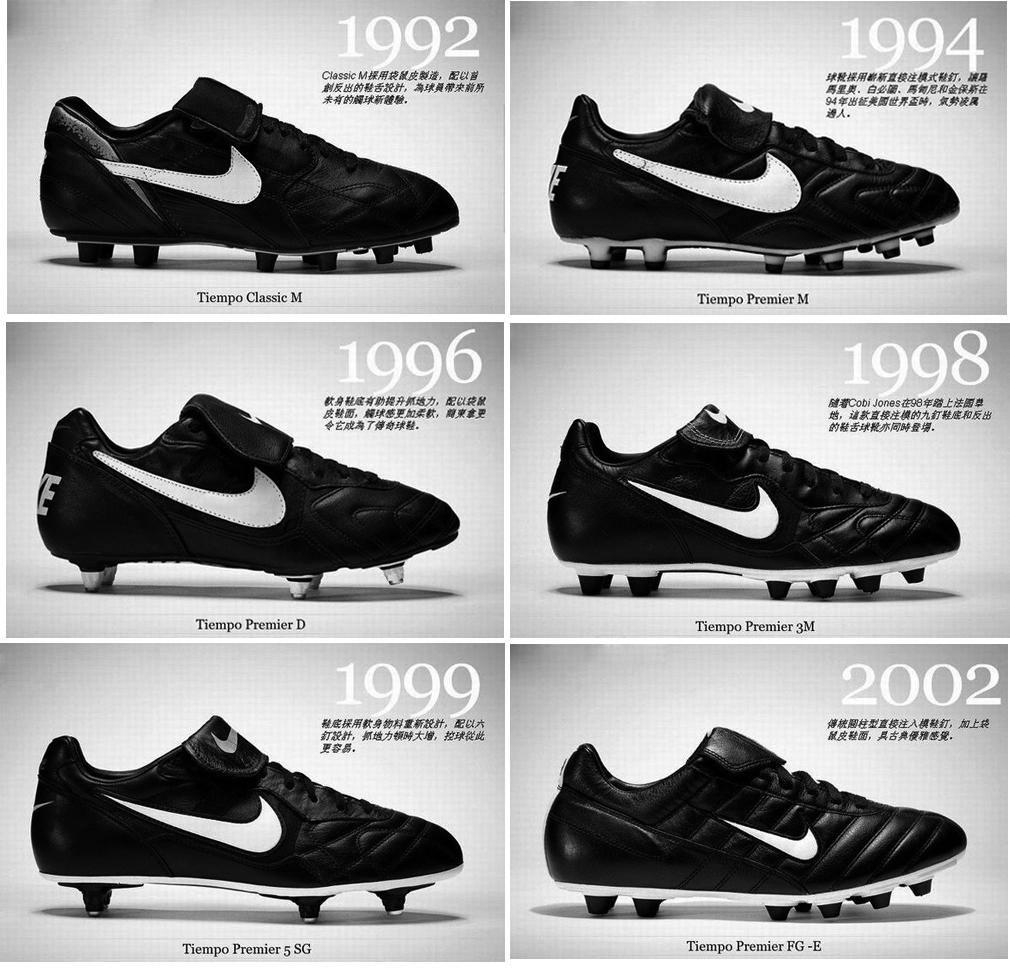 Tiempo Premier这一经典足球鞋款式,整整持续了13年,其中发布过6款足球鞋,发布年份分别为:1992,1994,1996,1998,1999和2002。每一代都做了或大或小的改进。