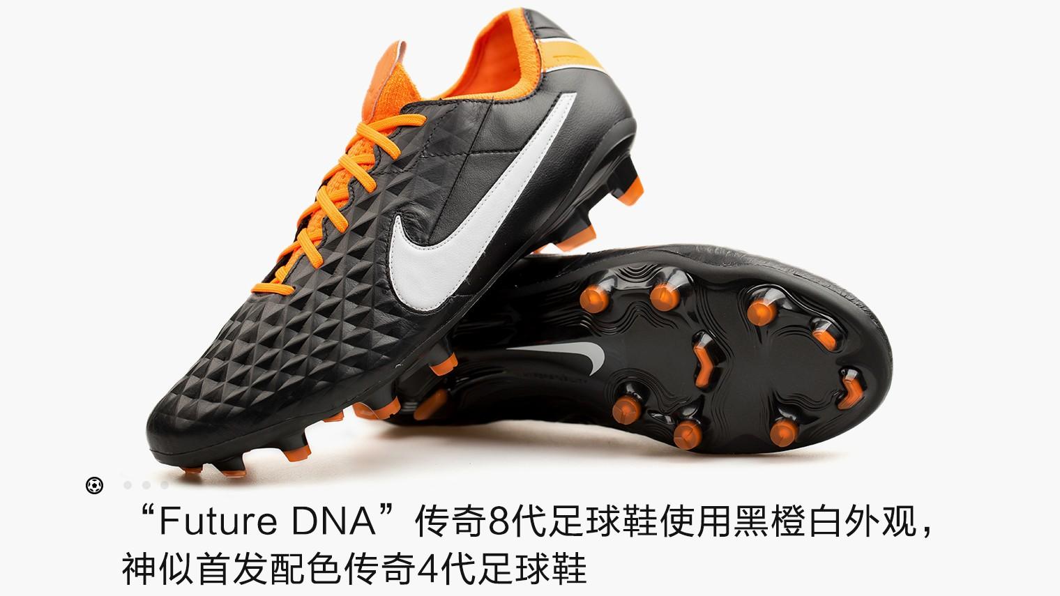 首发于2011年的耐克Tiempo Legend IV足球鞋算是当时Tiempo系列的创新战靴战靴,整体性能比之前的传奇3代有大幅提升。但是对传奇鞋迷来说,传奇4代的外观变化也非常难忘,比如翻折鞋舌的取消,又比如首发色鲜亮的橙色出现在鞋舌、鞋跟、鞋钉和鞋带上,非常亮眼。这一次耐克Future DNA配色几乎原样照搬了当年传奇4代的外观设计,打造出一双拥有返璞归真风格的限量战靴。